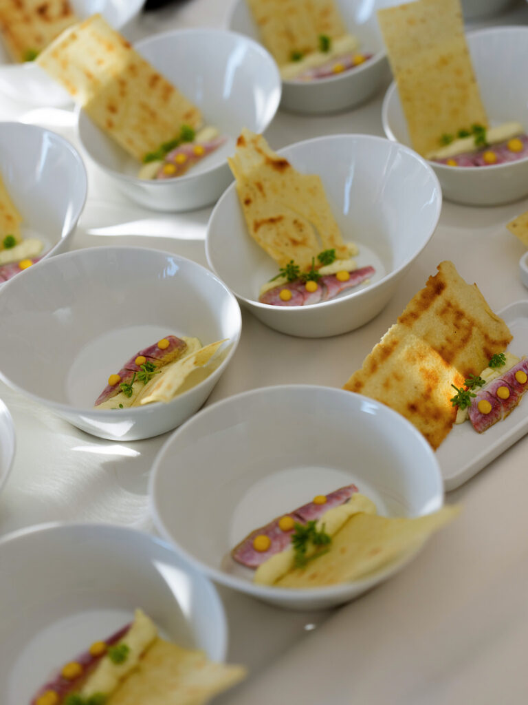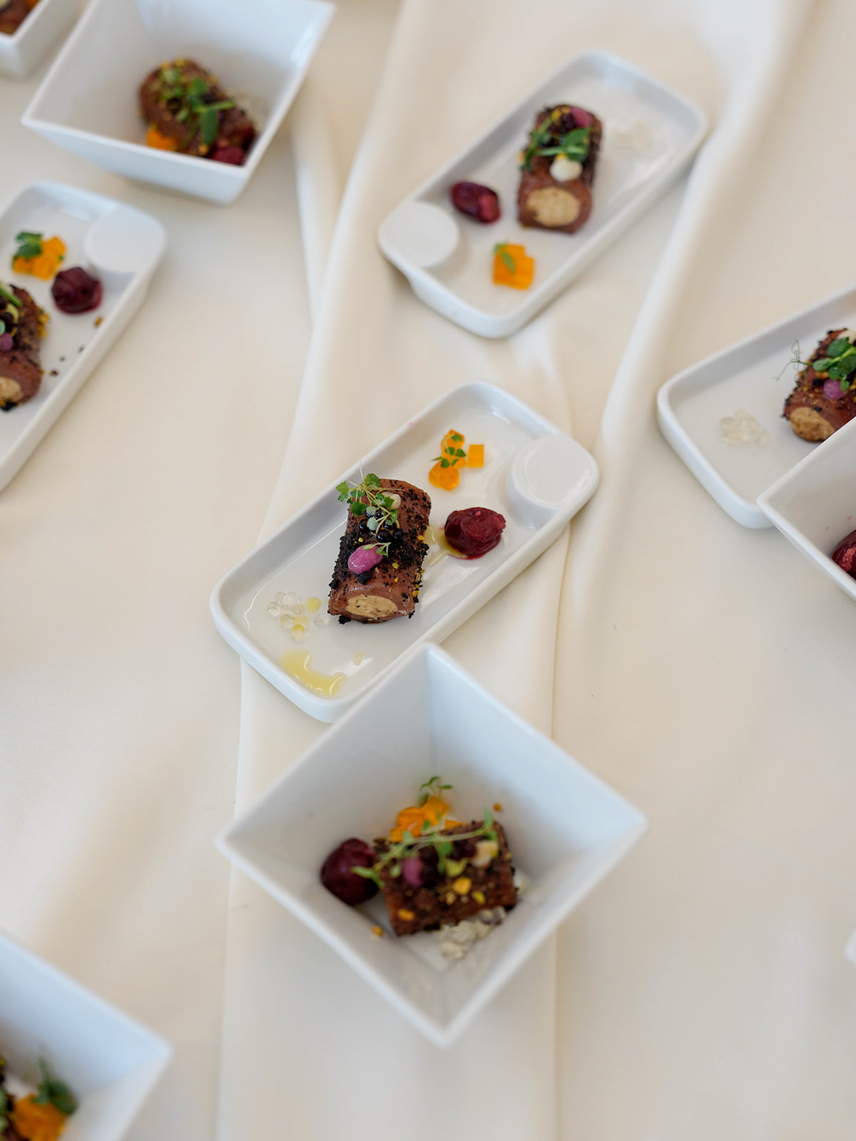 Dining at this Meneghetti Wine Hotel wedding was conceived as a journey. Guests explored a series of live cooking stations led by renowned chefs Zirojević and Skoko, whose refined approach highlighted seasonal ingredients and bold flavors. The presence of the chefs added a theatrical and social dimension to the evening, while Meneghetti’s award-winning wines tied the experience seamlessly to the estate’s culinary identity.