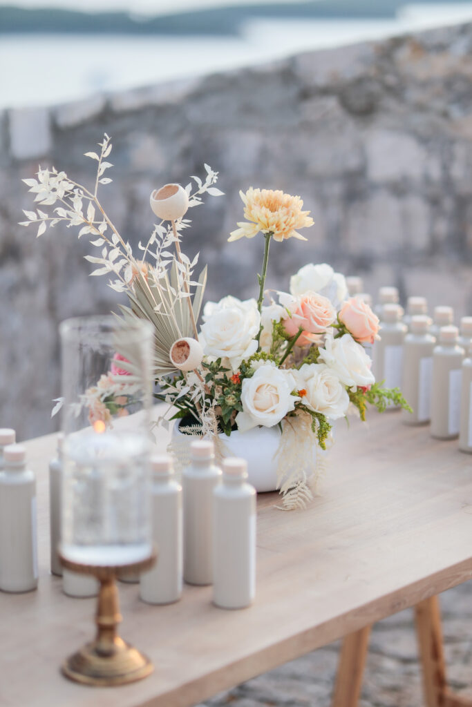 For their reception, the couple chose the Spanish Fortress Castle in Hvar. This venue is known for its breathtaking views and historical charm. Their elegant reception was beautifully designed, featuring relaxing patterns, textures, and colors that created a harmonious atmosphere. Guests enjoyed cocktails and canapés while taking in panoramic views of Hvar. To express their gratitude, Khyla and Daniel gave personalized bottles of Croatian olive oil as gifts to all their friends and family.