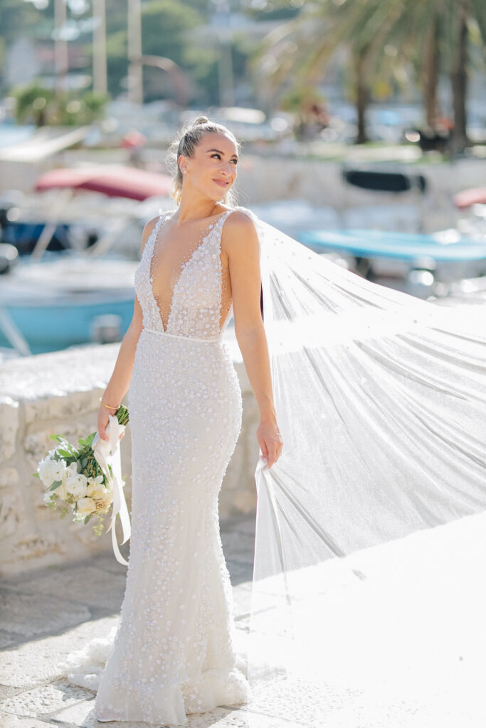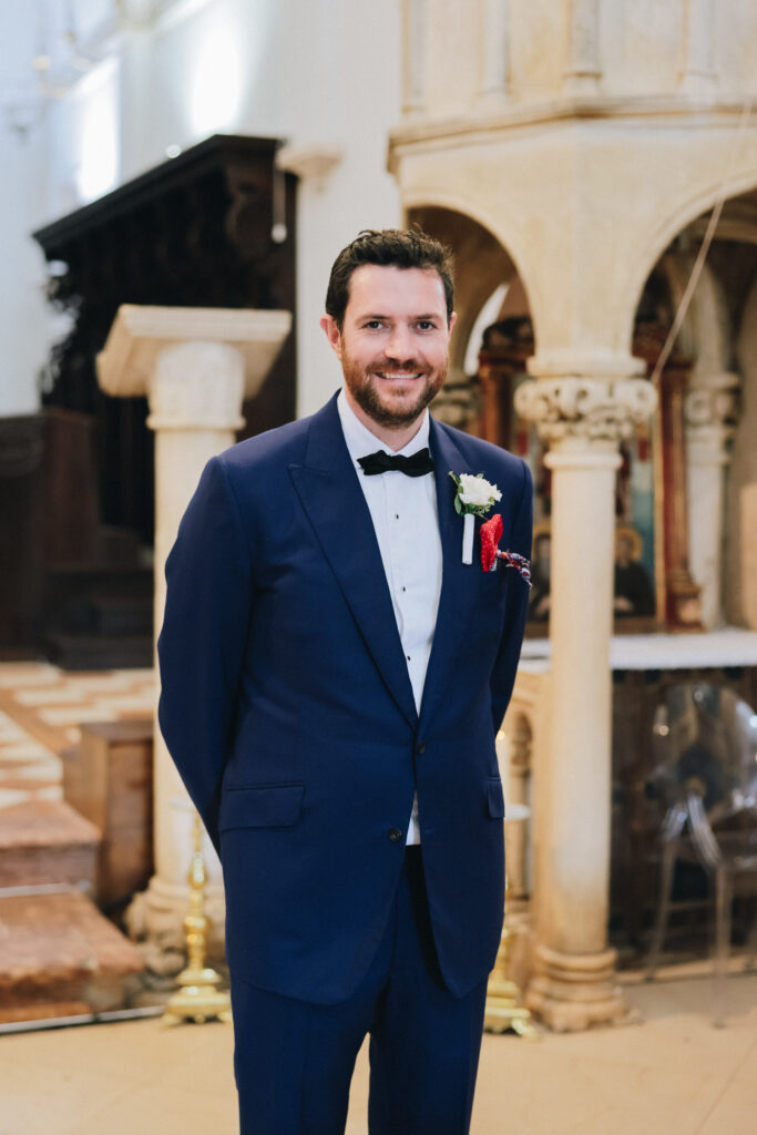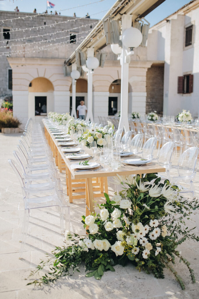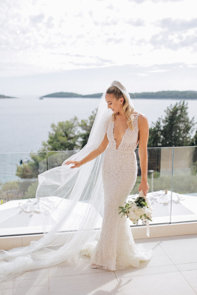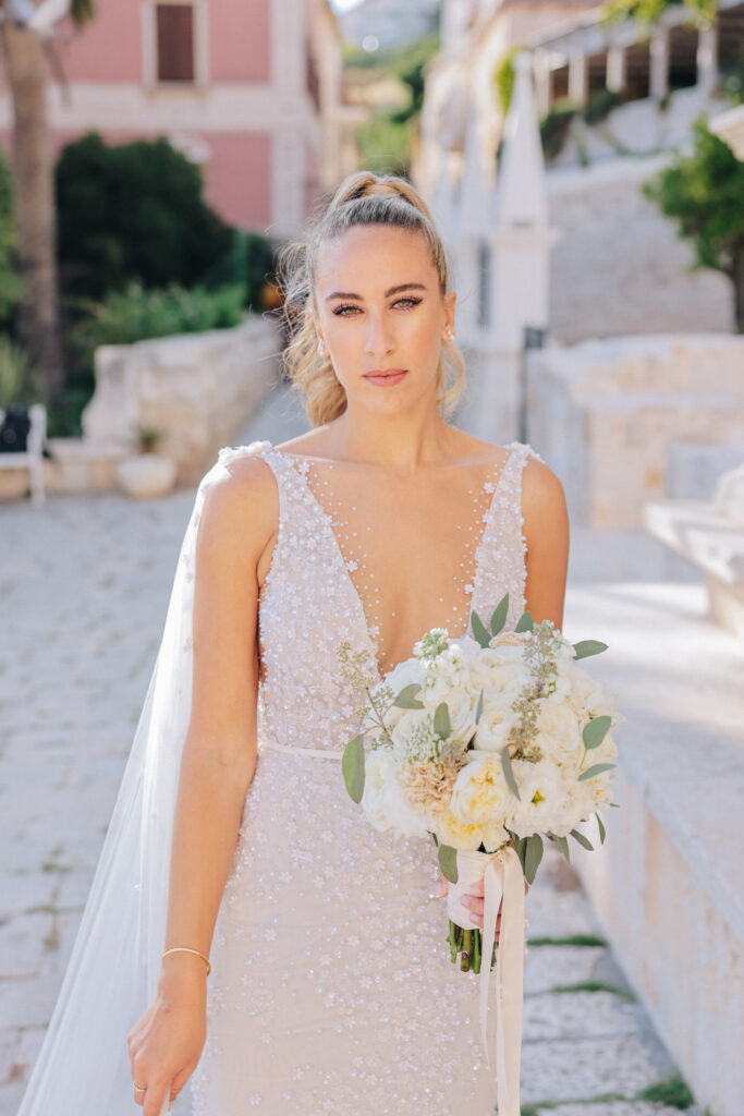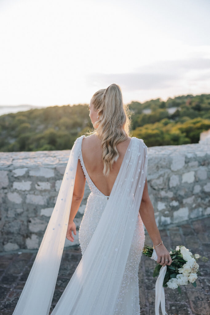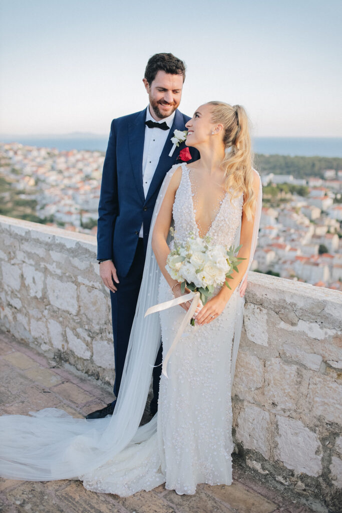 The couple united in holy matrimony at St. Stephan Cathedral, a historic venue in Croatia. The classic yet modern theme for their reception, envisioned by the bride, was brought to life with luxurious floral arrangements in green and white. Their reception took place at the Spanish fortress in Hvar, which has a stunning rooftop perfect for cocktail parties — an element the couple truly loved.