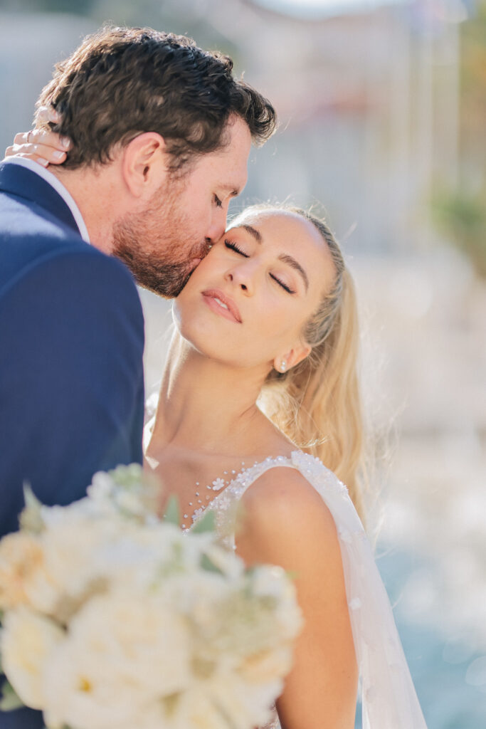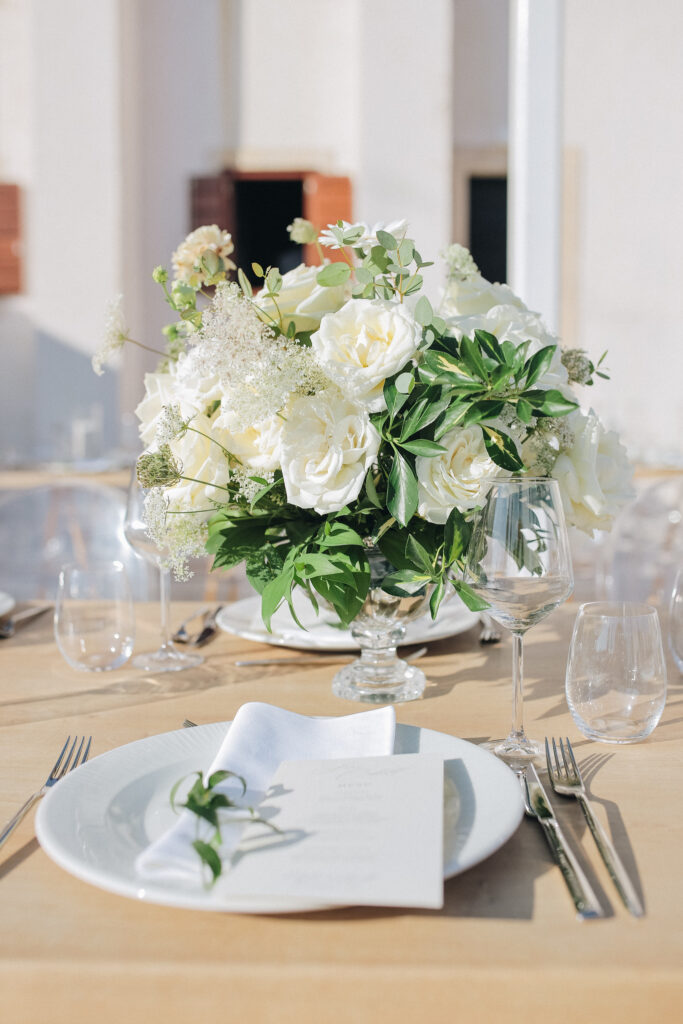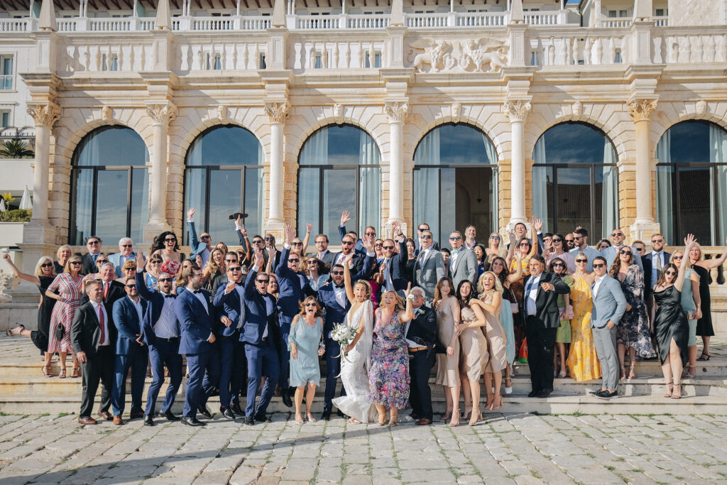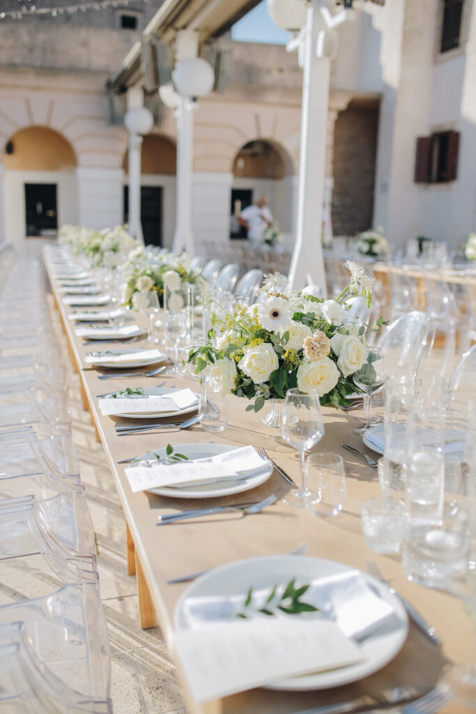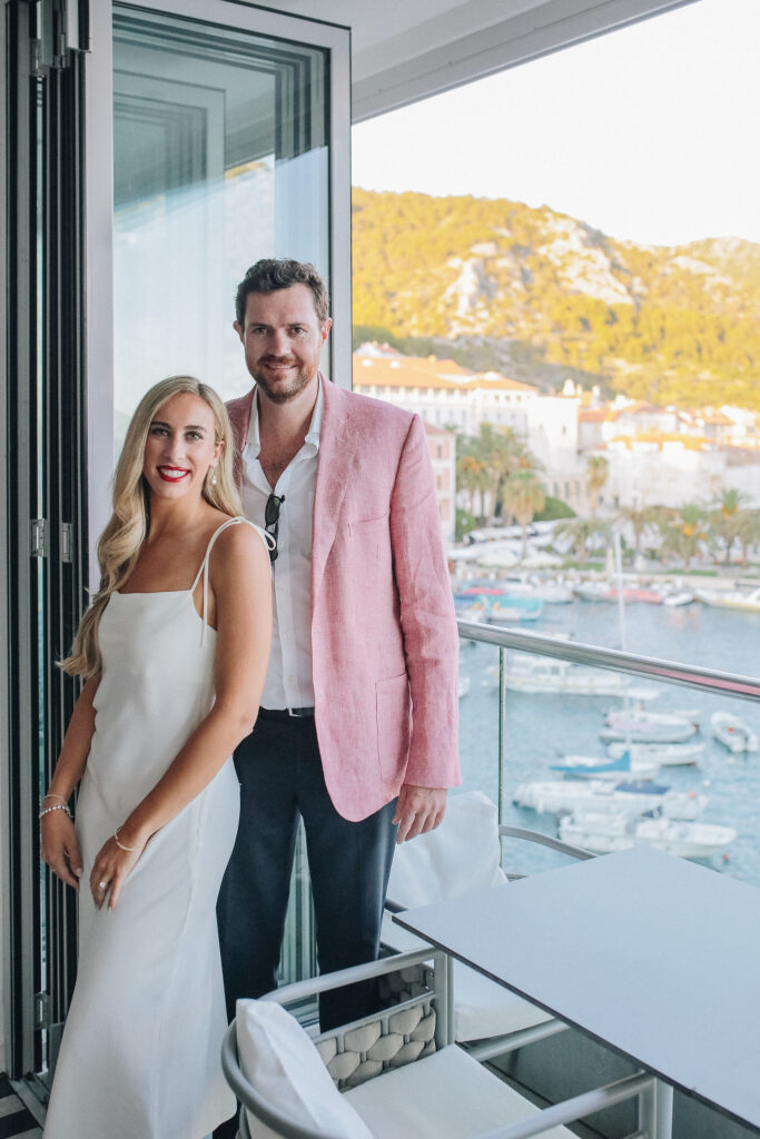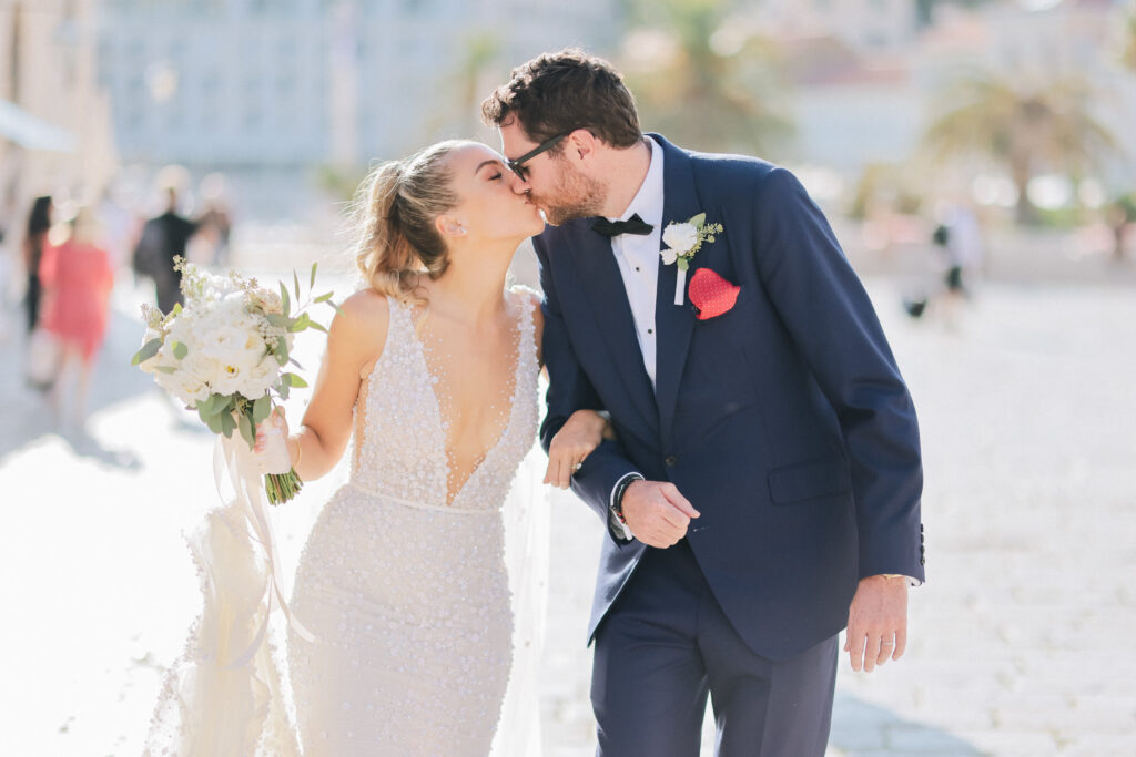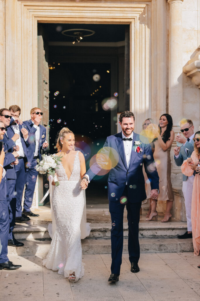 The couple united in holy matrimony at St. Stephan Cathedral, a historic venue in Croatia. The classic yet modern theme for their reception, envisioned by the bride, was brought to life with luxurious floral arrangements in green and white. Their reception took place at the Spanish fortress in Hvar, which has a stunning rooftop perfect for cocktail parties — an element the couple truly loved.