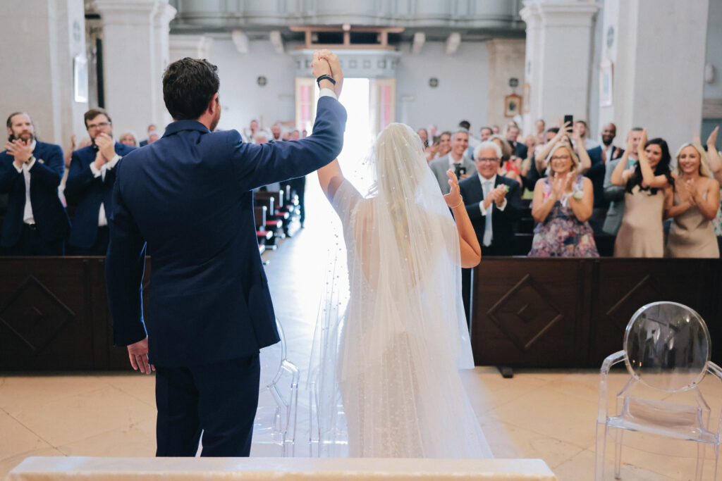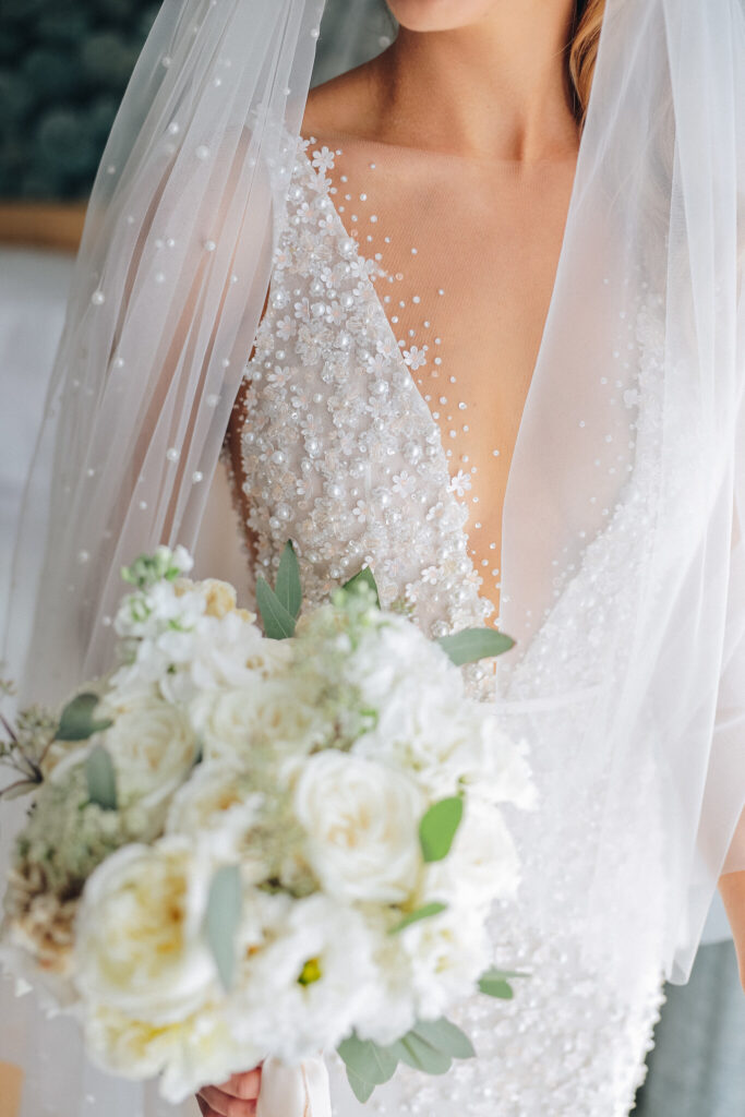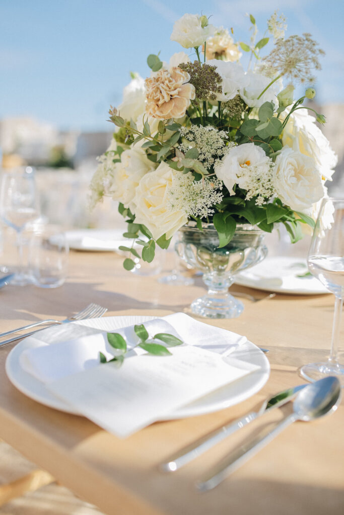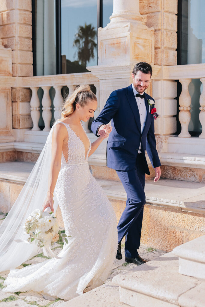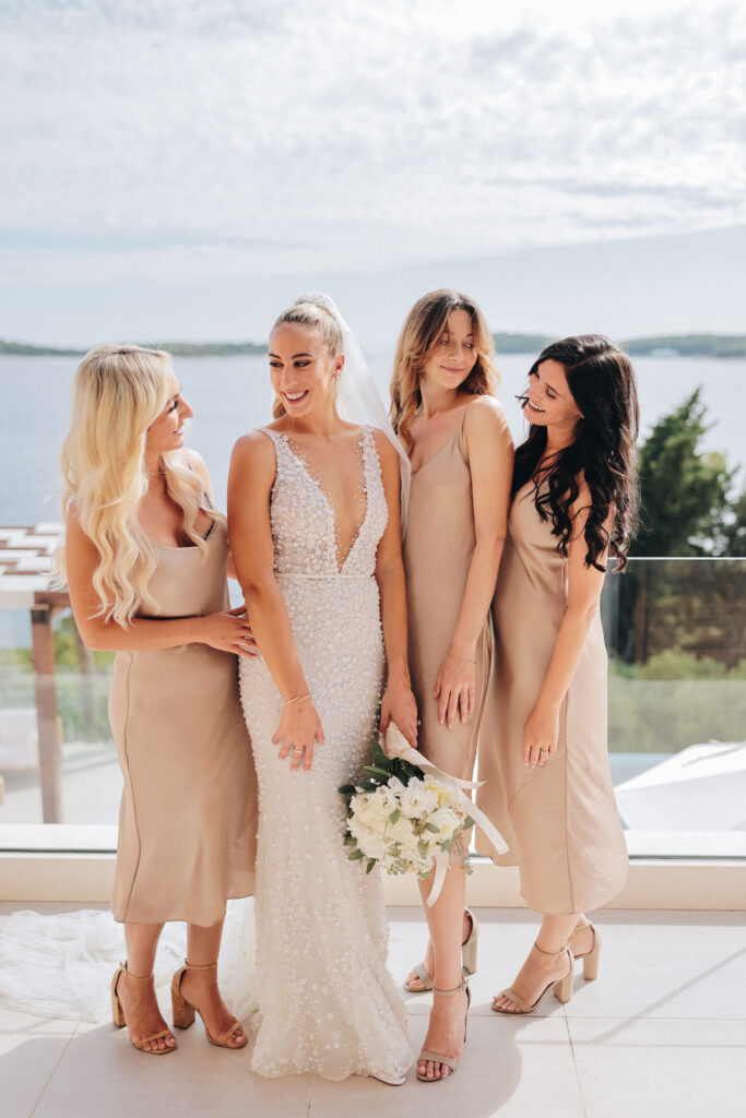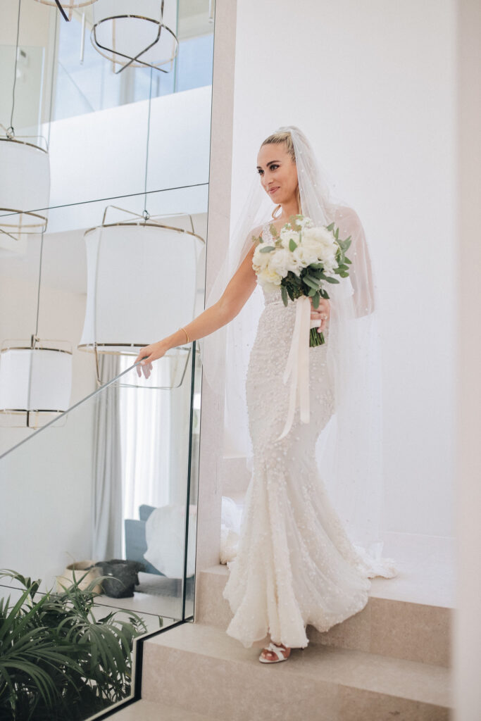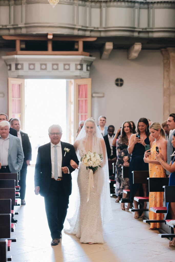 The couple united in holy matrimony at St. Stephan Cathedral, a historic venue in Croatia. The classic yet modern theme for their reception, envisioned by the bride, was brought to life with luxurious floral arrangements in green and white. Their reception took place at the Spanish fortress in Hvar, which has a stunning rooftop perfect for cocktail parties — an element the couple truly loved.