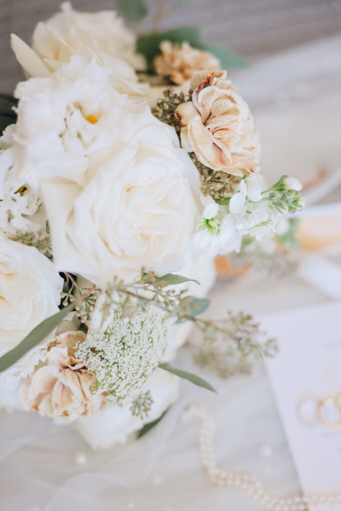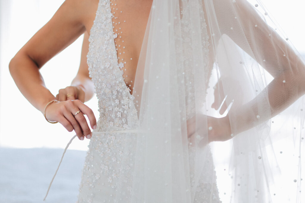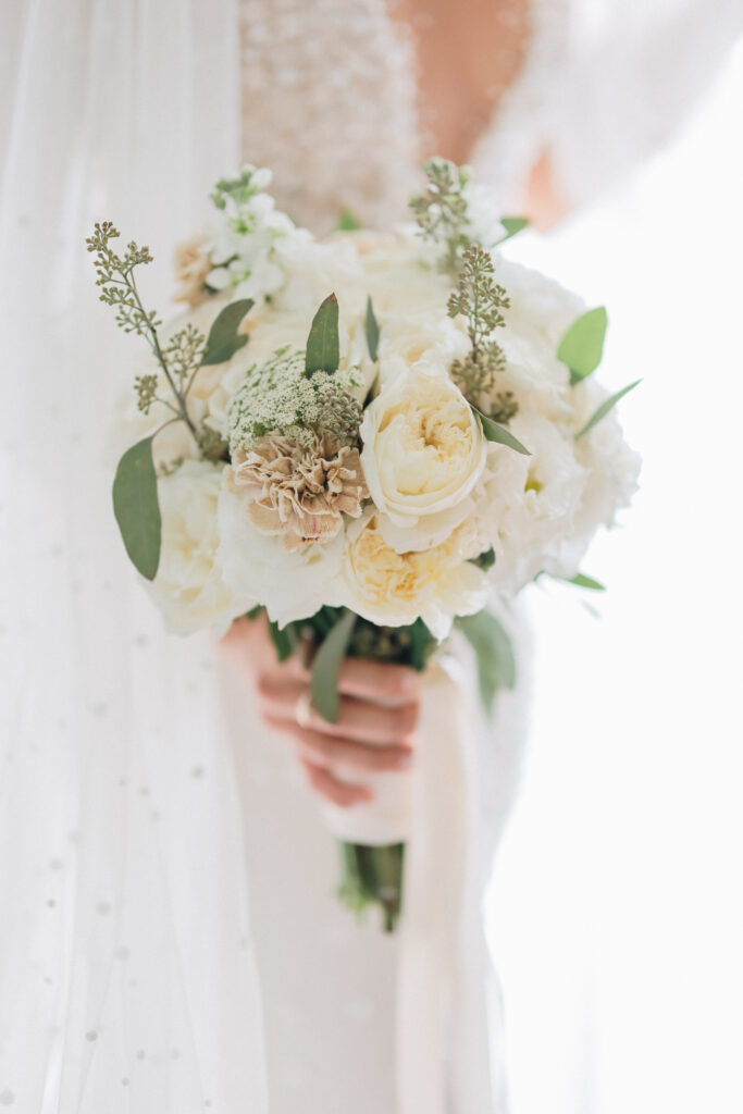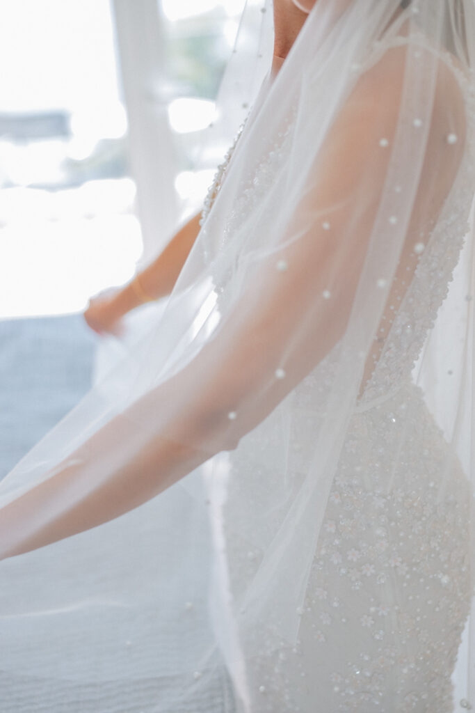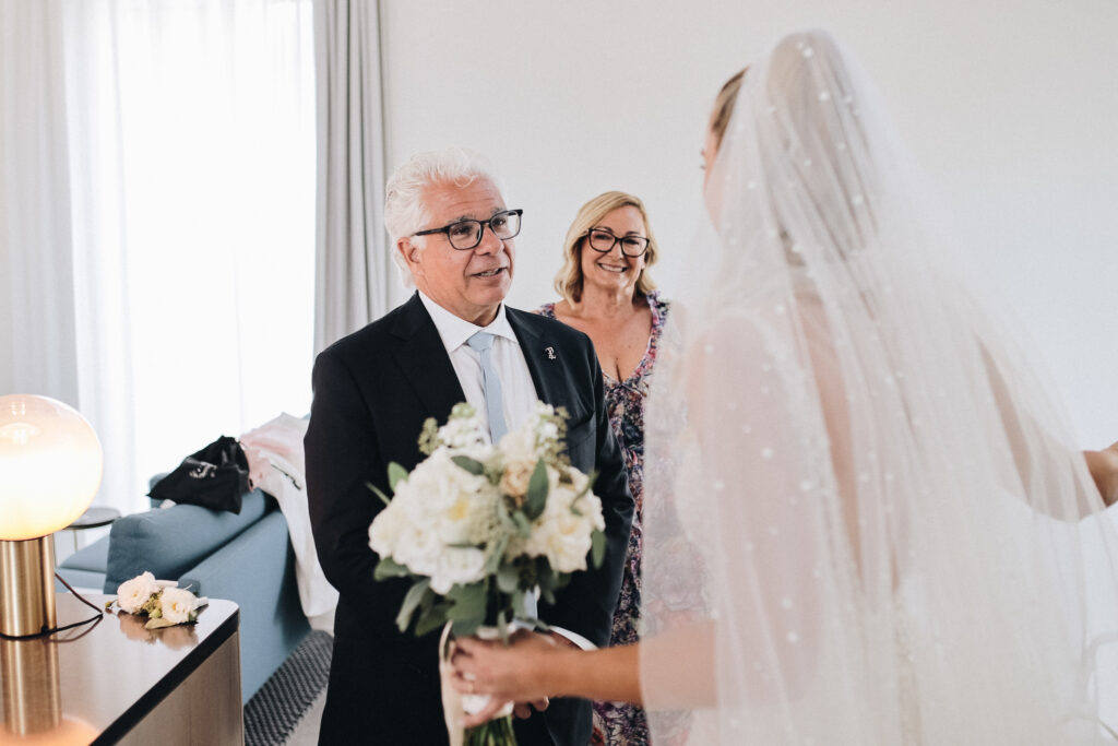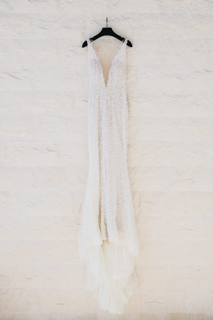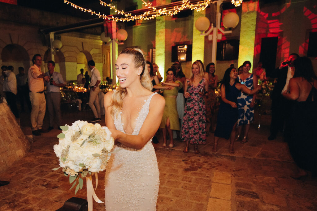 The couple united in holy matrimony at St. Stephan Cathedral, a historic venue in Croatia. The classic yet modern theme for their reception, envisioned by the bride, was brought to life with luxurious floral arrangements in green and white. Their reception took place at the Spanish fortress in Hvar, which has a stunning rooftop perfect for cocktail parties — an element the couple truly loved.