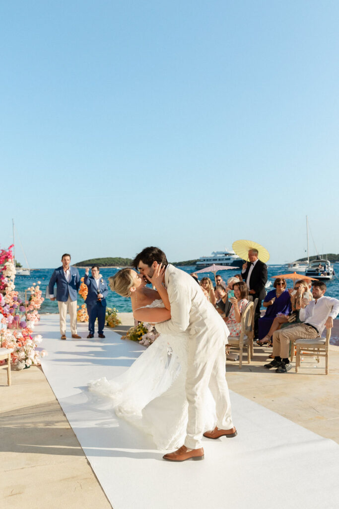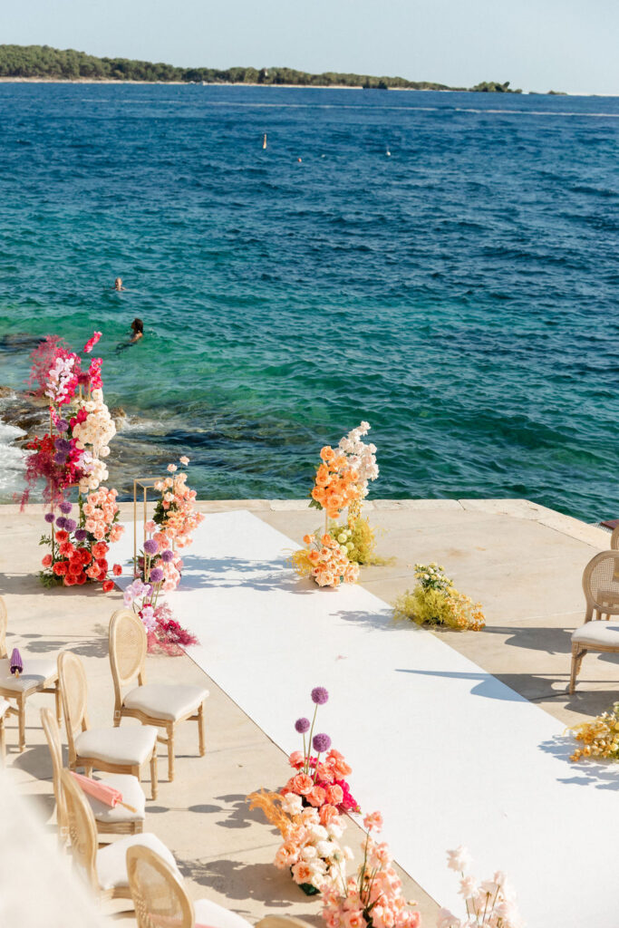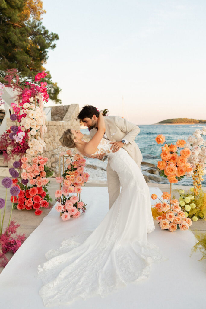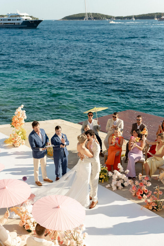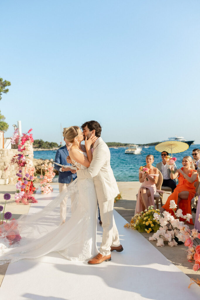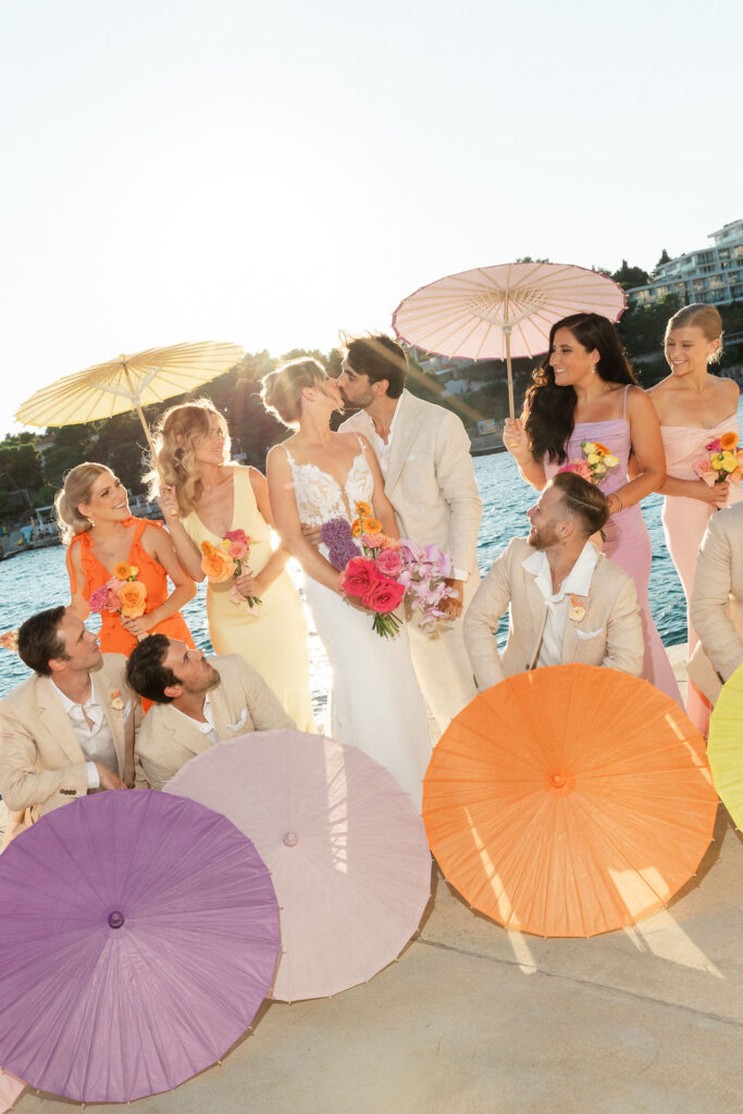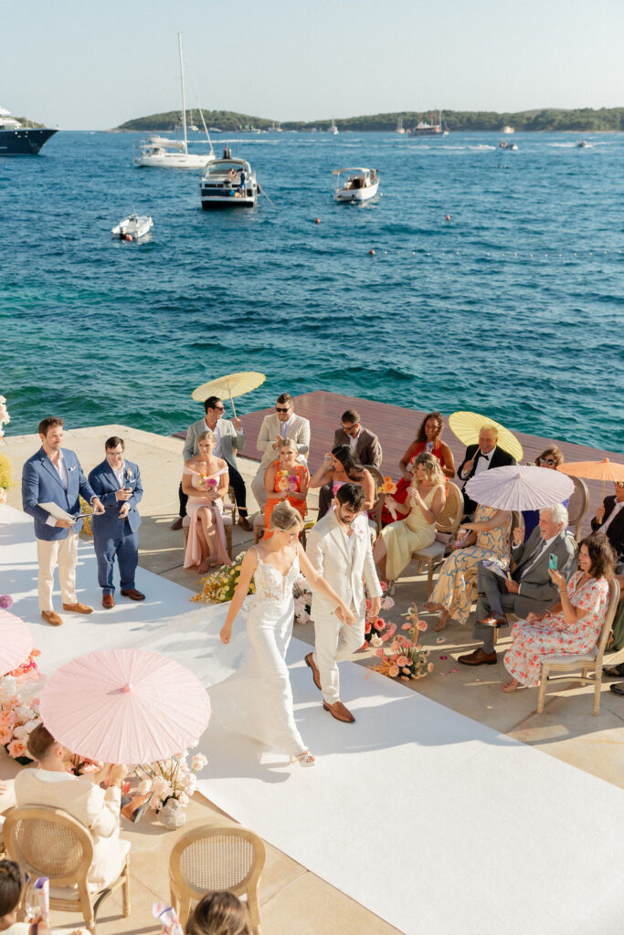 The day began with a breathtaking beachfront ceremony at the stunning Beach Club Hvar. With its turquoise waters and picturesque setting, the venue provided the ideal backdrop for Anna and Max’s vows. Pink florals lined the aisle, while colorful umbrellas offered shade, ensuring guests stayed comfortable under the sun.