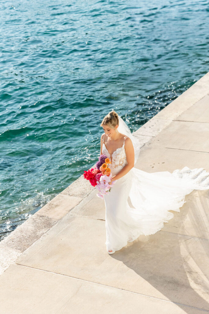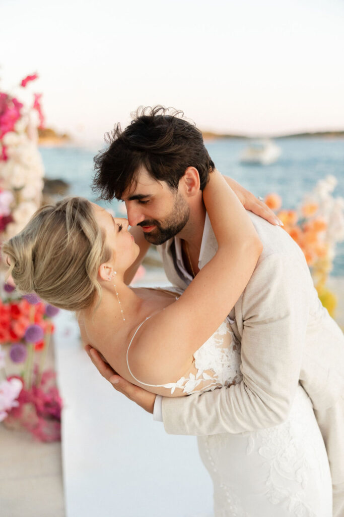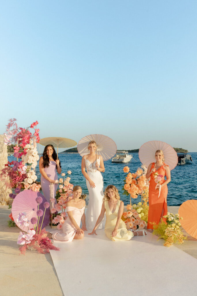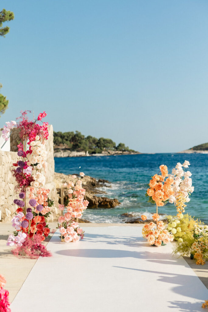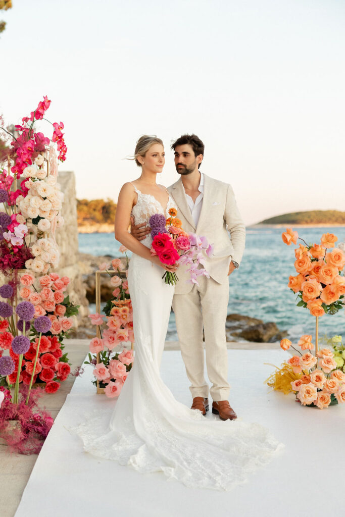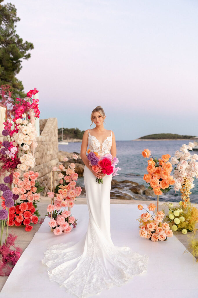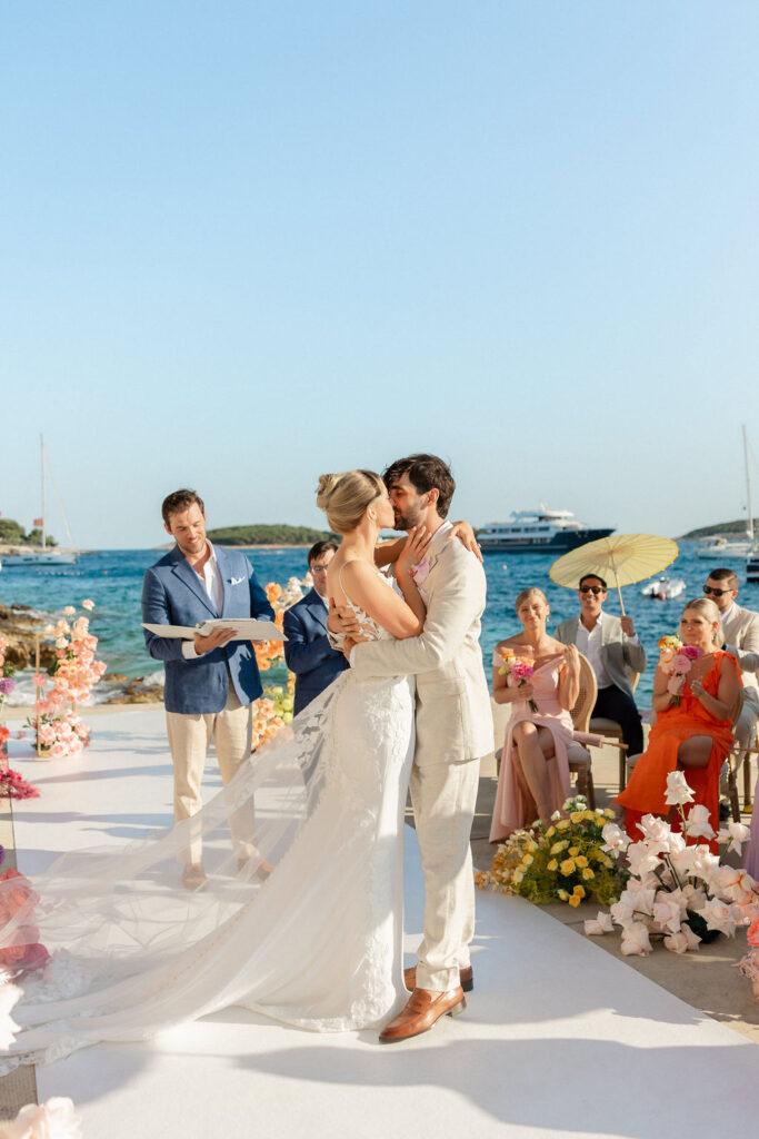 The day began with a breathtaking beachfront ceremony at the stunning Beach Club Hvar. With its turquoise waters and picturesque setting, the venue provided the ideal backdrop for Anna and Max’s vows. Pink florals lined the aisle, while colorful umbrellas offered shade, ensuring guests stayed comfortable under the sun.