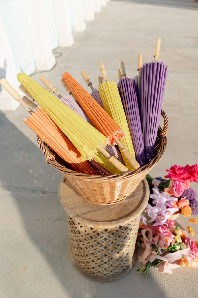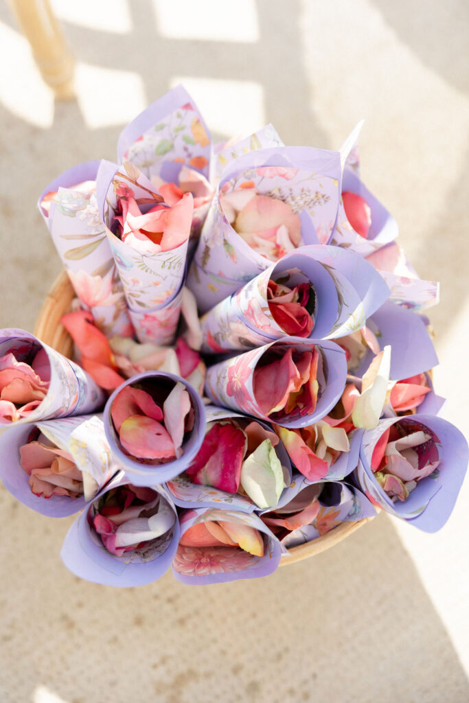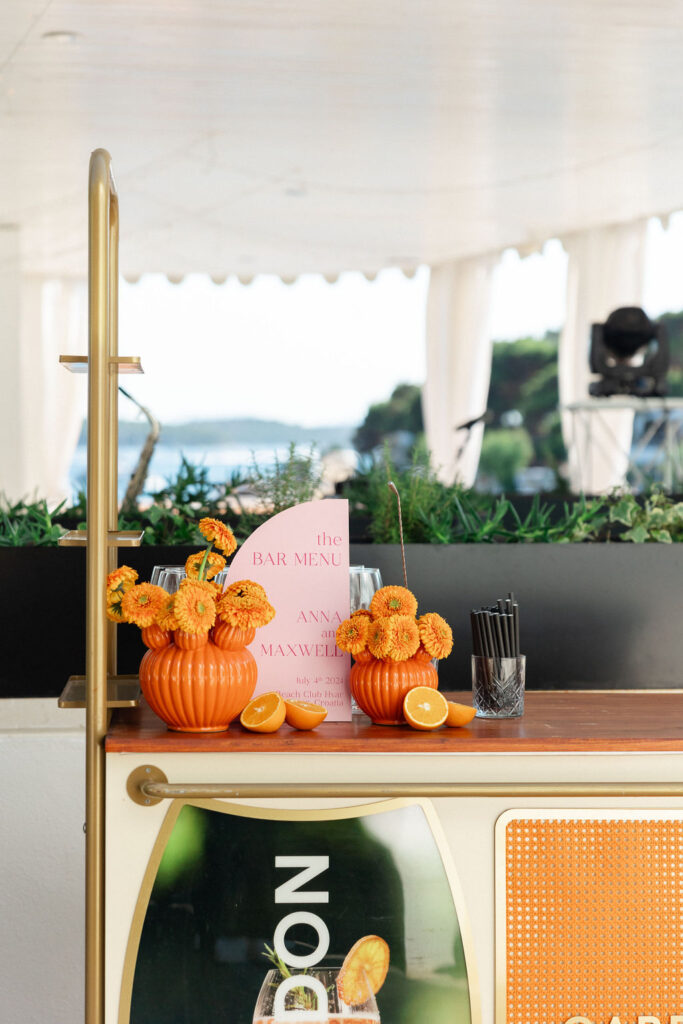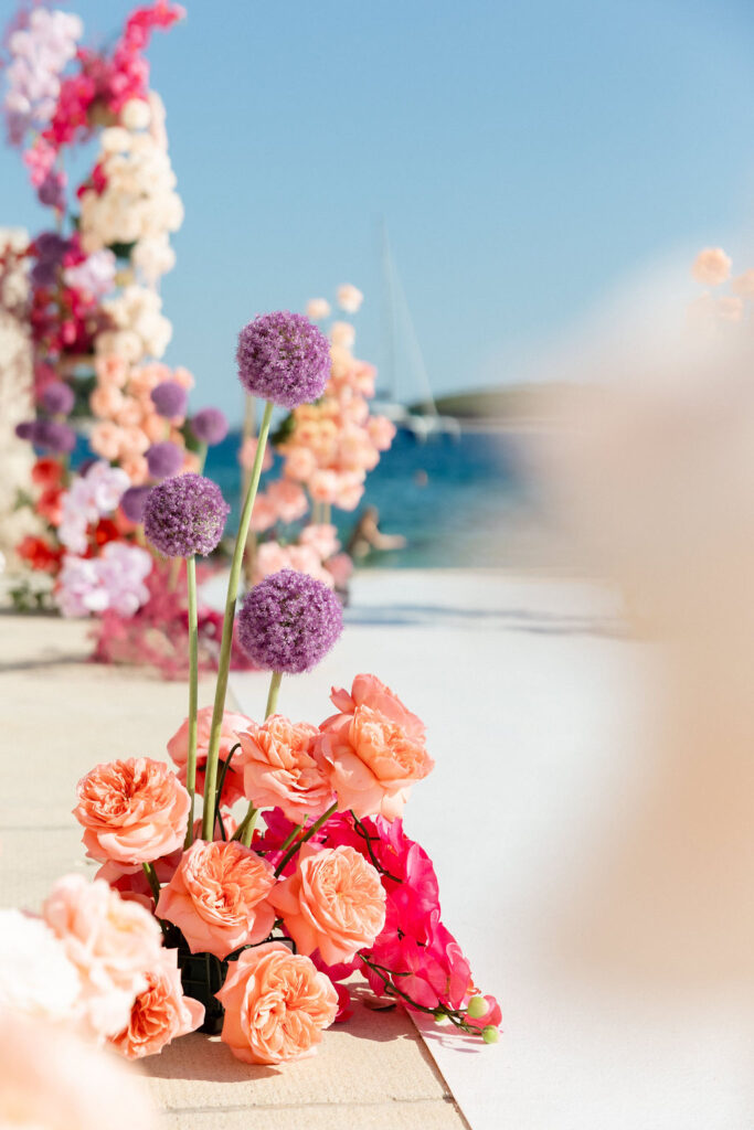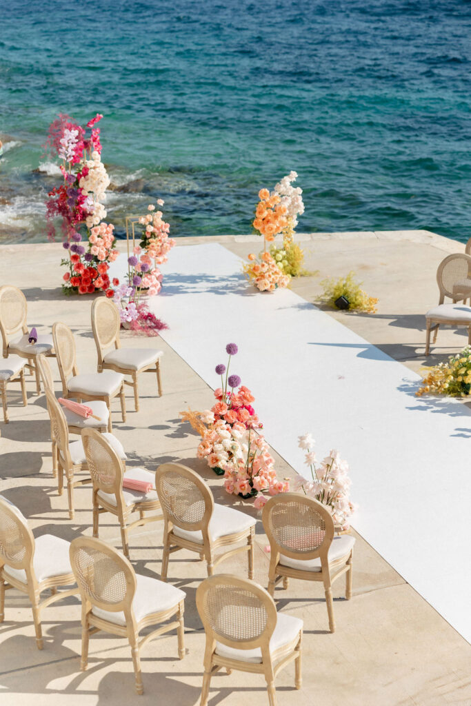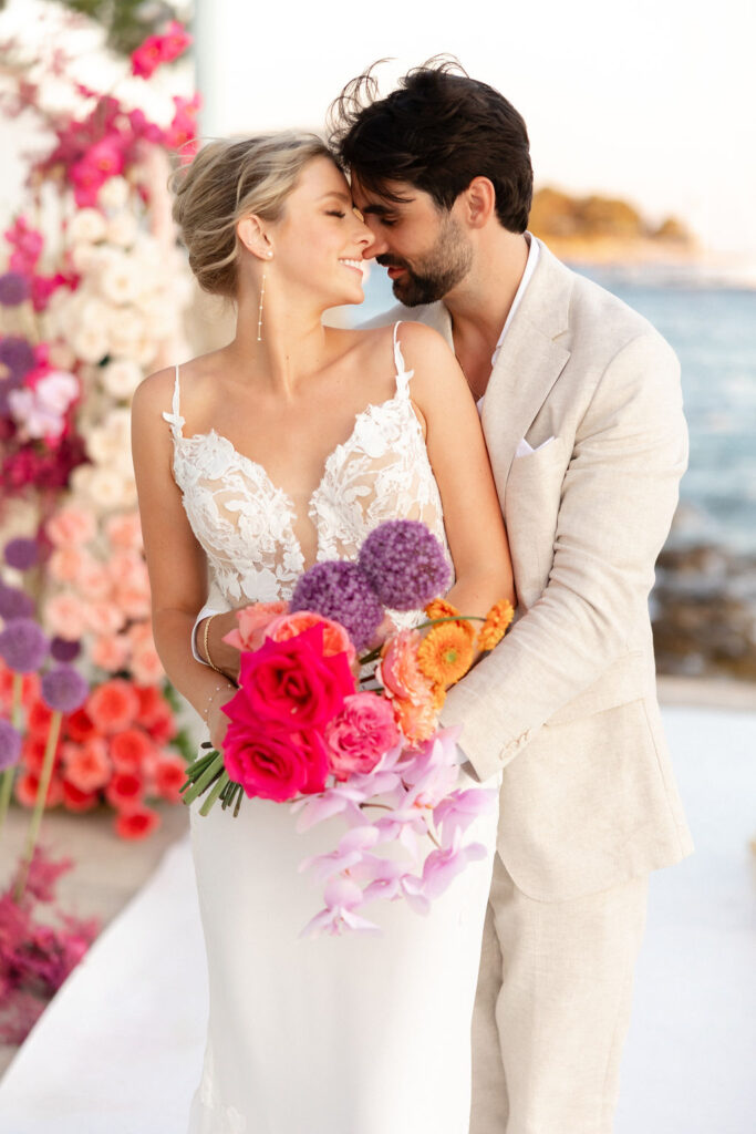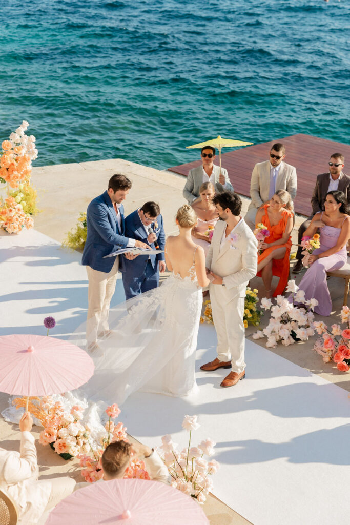 The day began with a breathtaking beachfront ceremony at the stunning Beach Club Hvar. With its turquoise waters and picturesque setting, the venue provided the ideal backdrop for Anna and Max’s vows. Pink florals lined the aisle, while colorful umbrellas offered shade, ensuring guests stayed comfortable under the sun.
