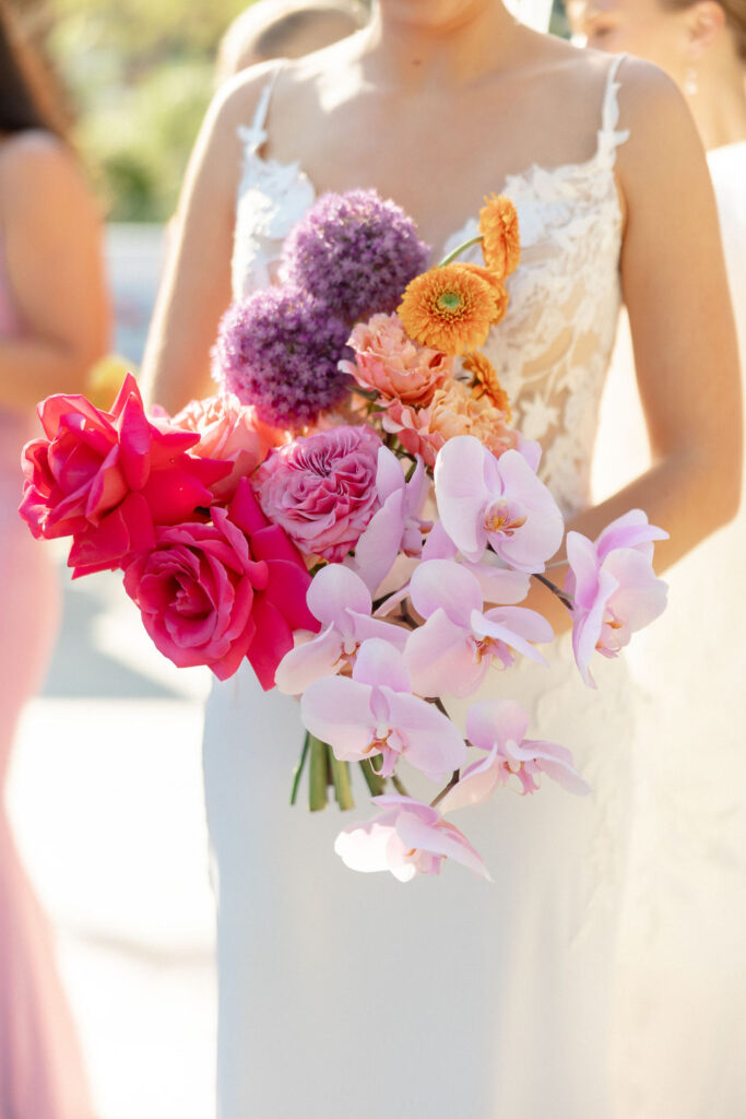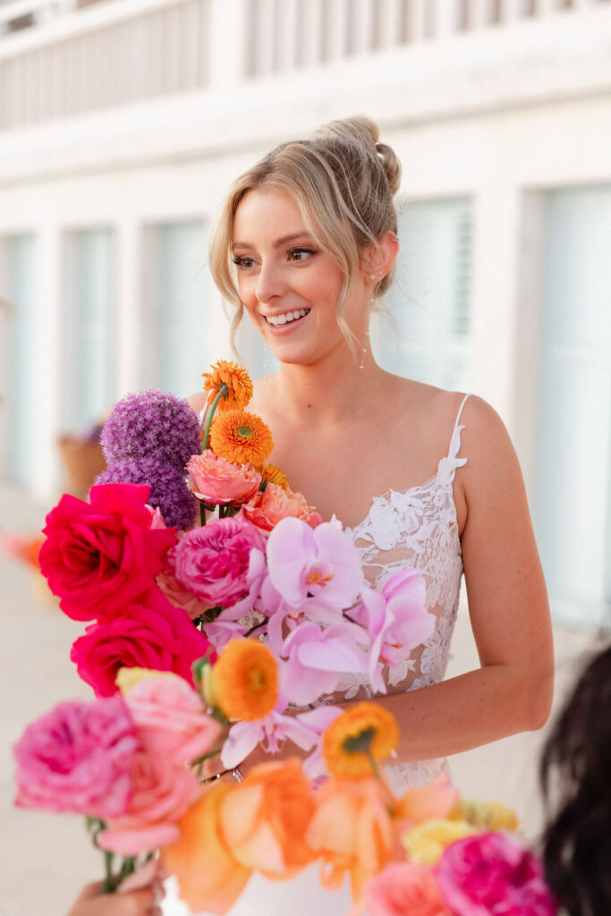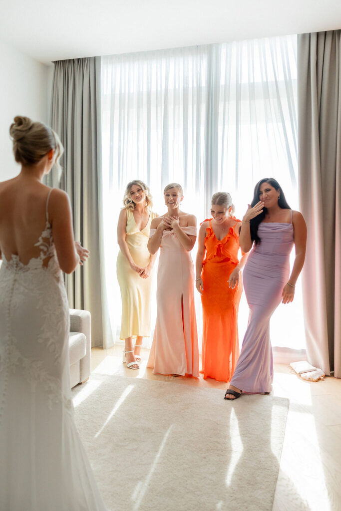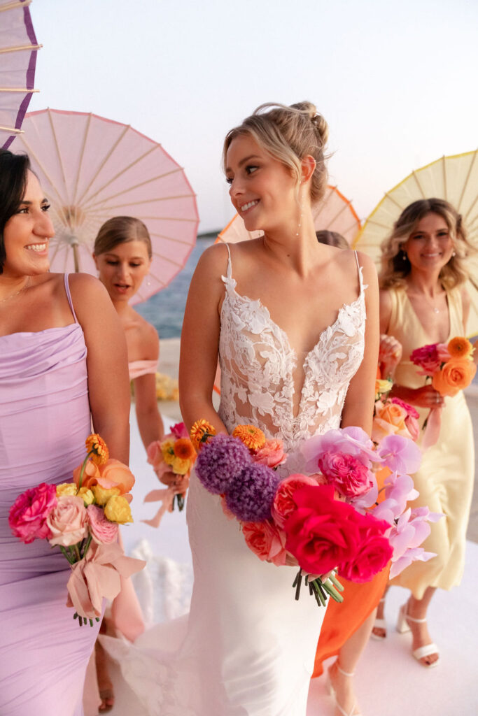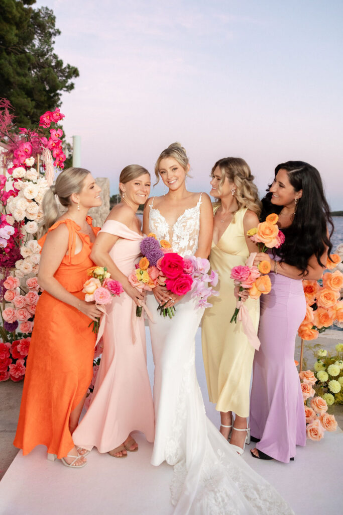 Anna’s bridesmaids wore dresses in varying hues, adding a fresh twist to the traditional matching attire. This creative approach perfectly complemented the cheerful energy of the day and brought their vibrant vision to life.