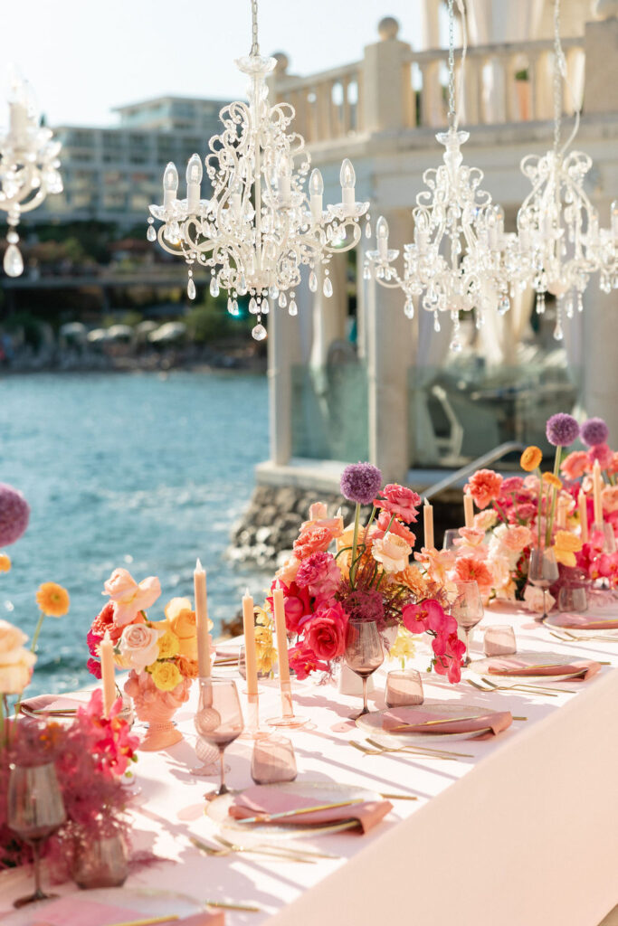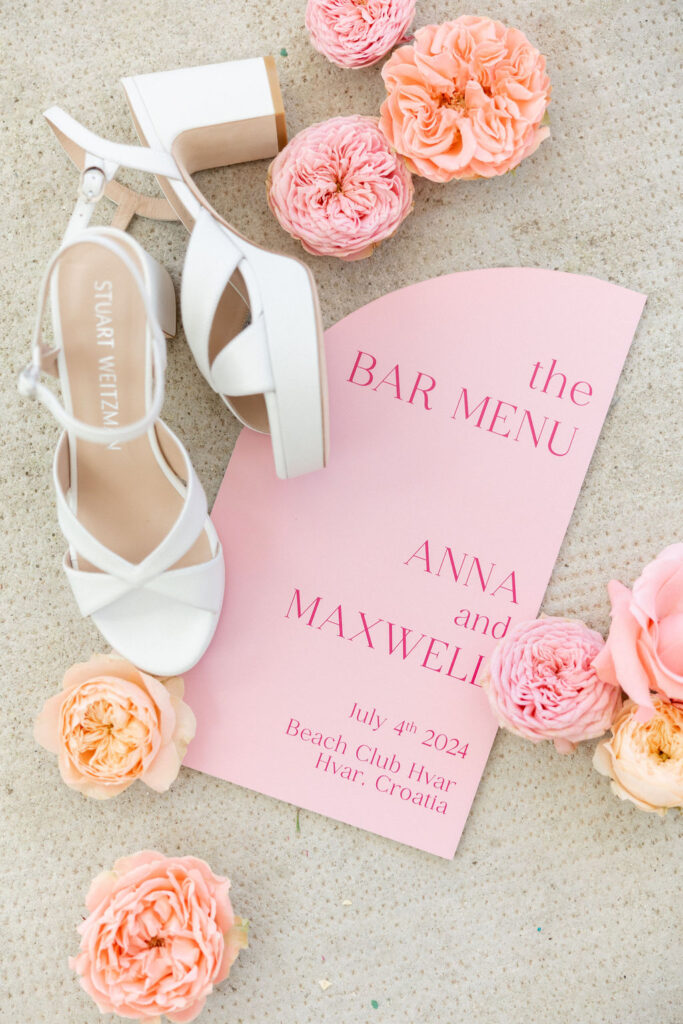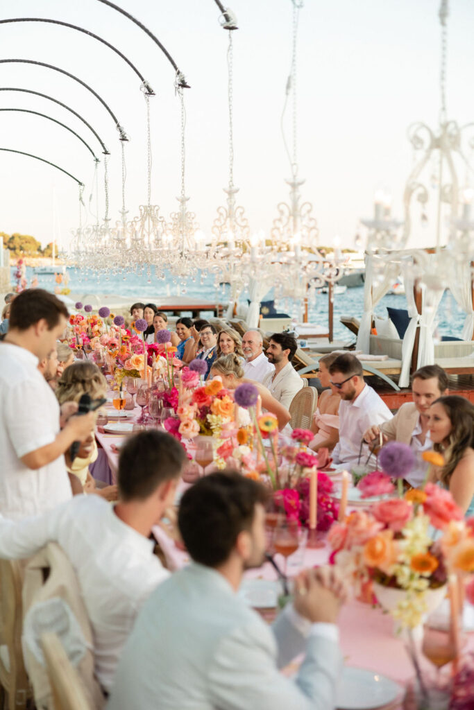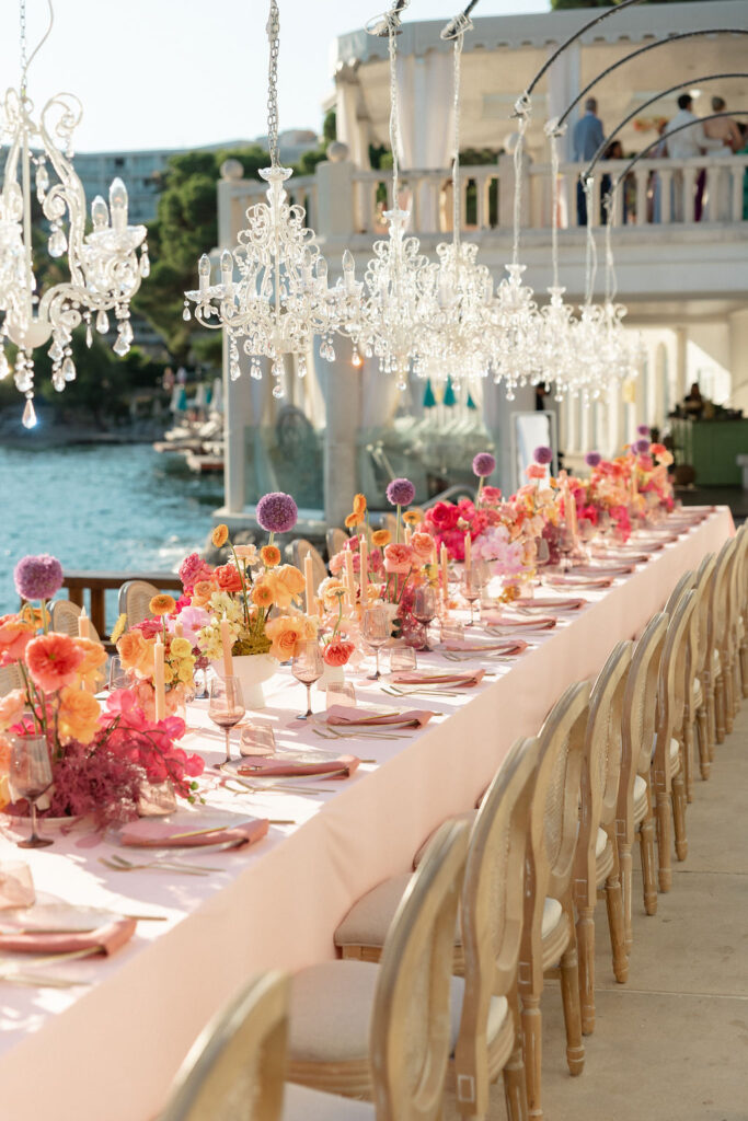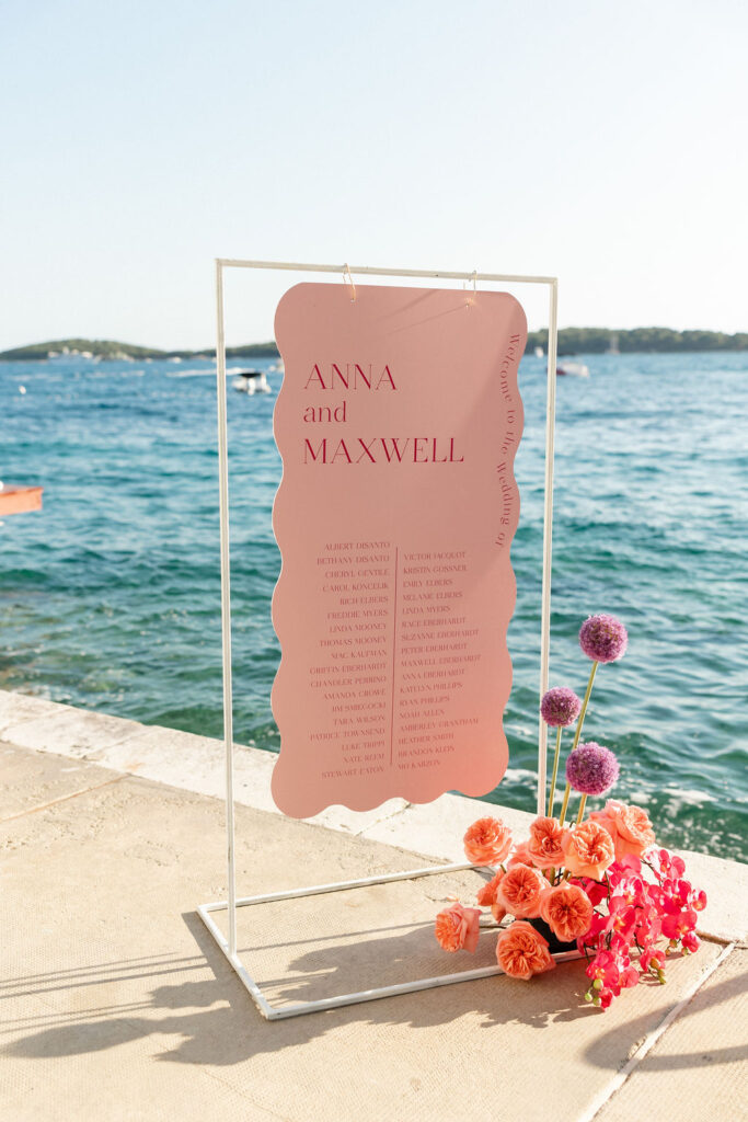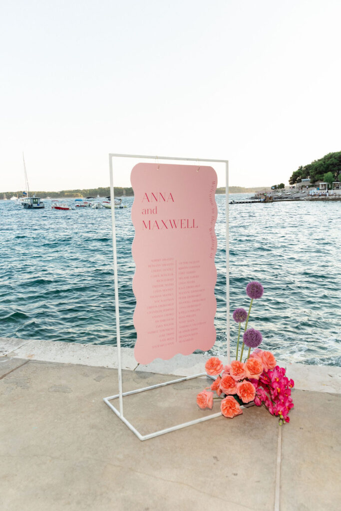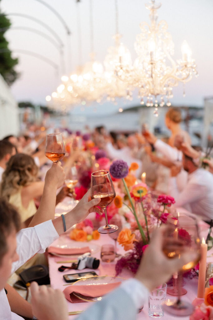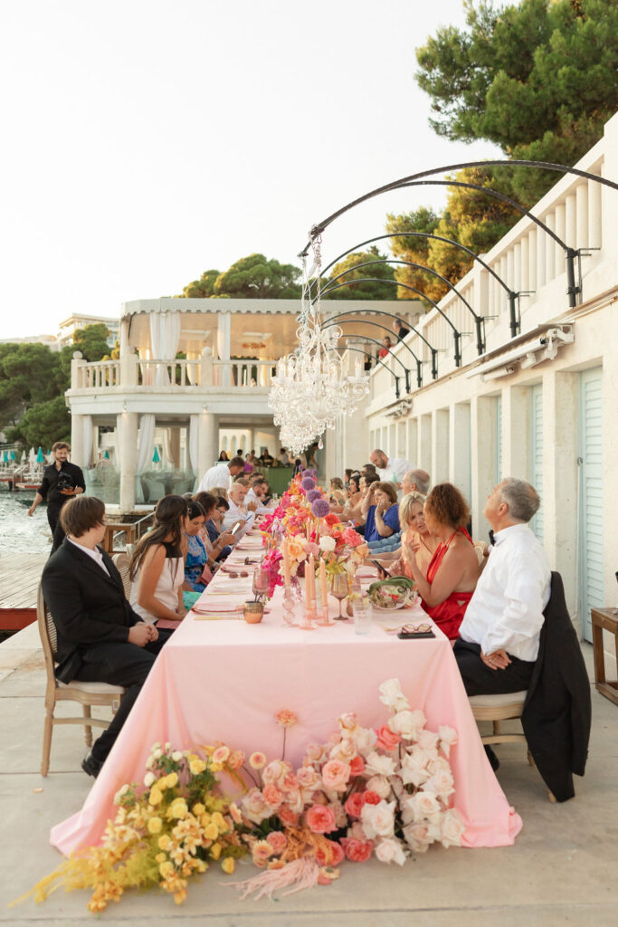 The pink theme was woven throughout—from the intricately designed floral centerpieces to the personalized menus. Each element reflected Anna and Max’s vision, creating an atmosphere that felt both glamorous and inviting. Dinner was a culinary delight, featuring local Croatian flavors with a modern twist. Guests savored their meals as the gentle sound of waves provided a soothing soundtrack to an unforgettable evening.