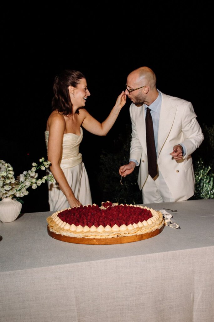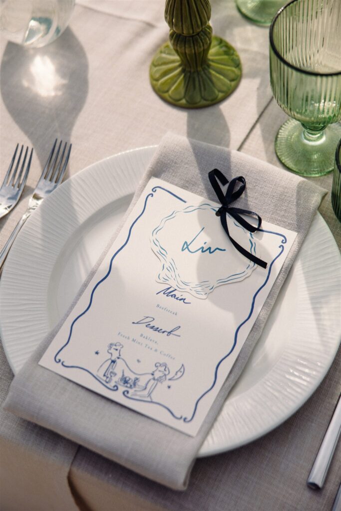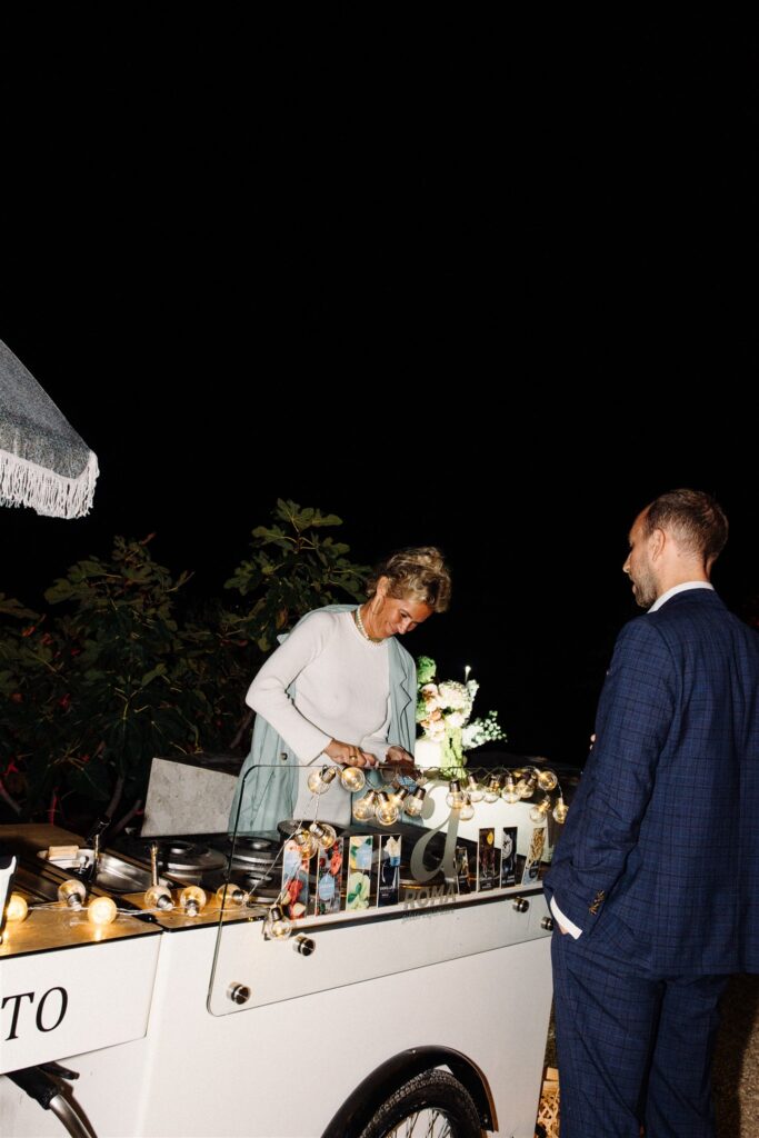 As the night fell, the reception turned into a lively, unforgettable party. Guests danced the Hora with pure energy, while soft candlelight illuminated elegant tables adorned with golden and white floral arrangements. The décor featured khaki and cream accents, refined silver cutlery, and green-ridged glassware for a sophisticated touch. A highlight of the evening was the dessert—a stylish ice cream cart with refreshing treats and the couple’s favorite Millefoglie cake, a delicate and decadent delight.