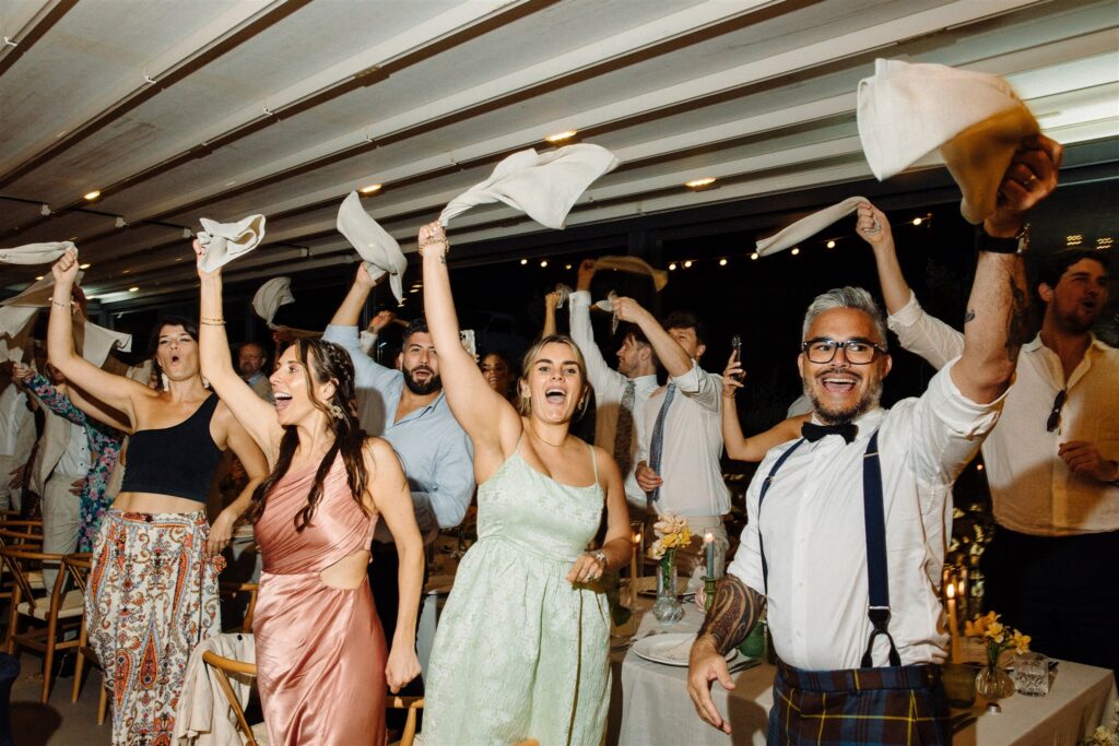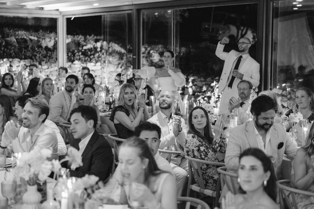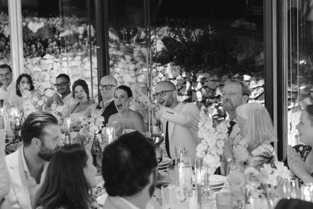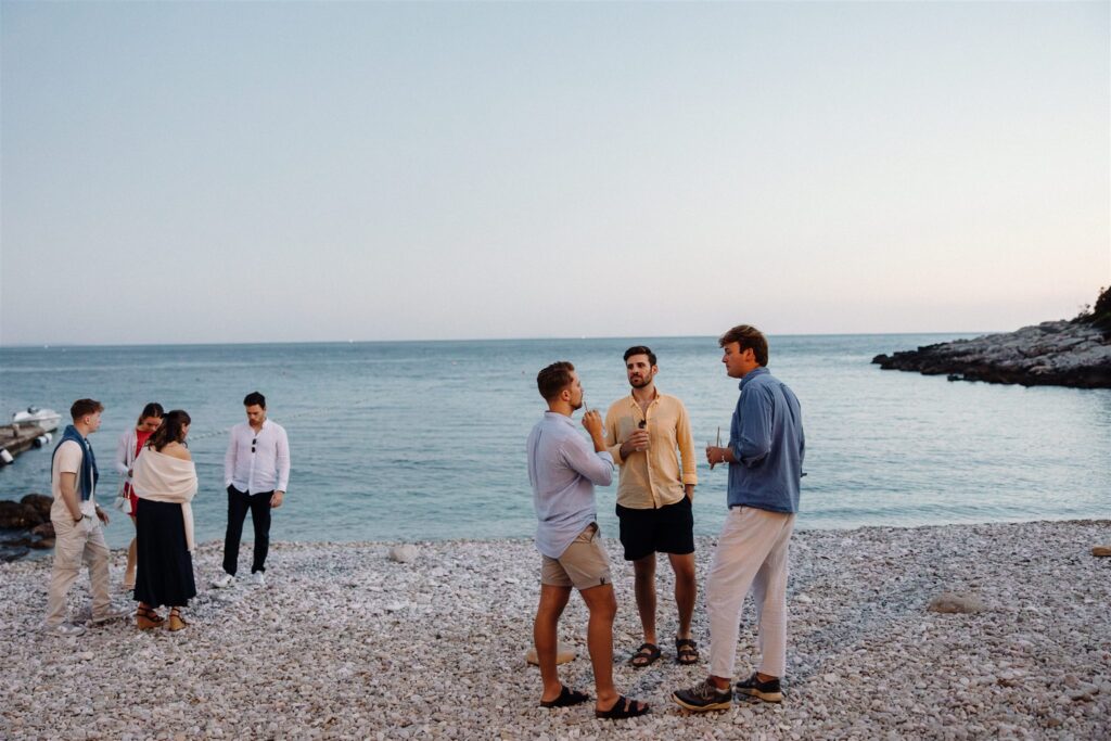 The festivities began with a stylish welcome reception at Notos Beach. Guests arrived by private boats, which immediately set the tone for an unforgettable experience. Meanwhile, as the sun dipped below the horizon, hues of orange and pink reflected across the Adriatic waters. This perfectly matched the wedding’s elegant color palette. In addition, a live band flown in from the UK created a magical ambiance.