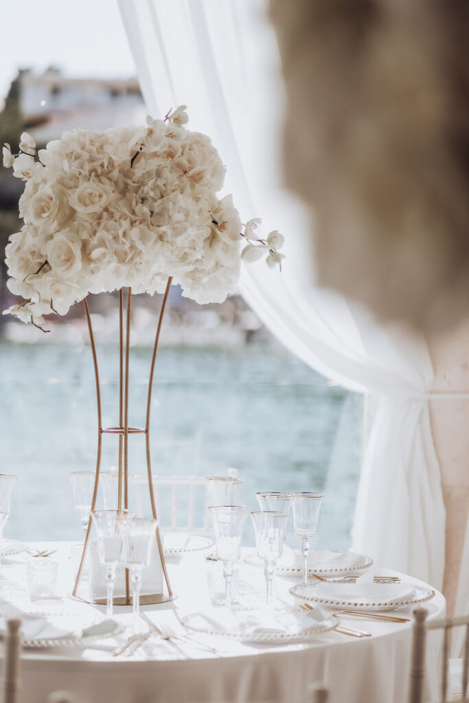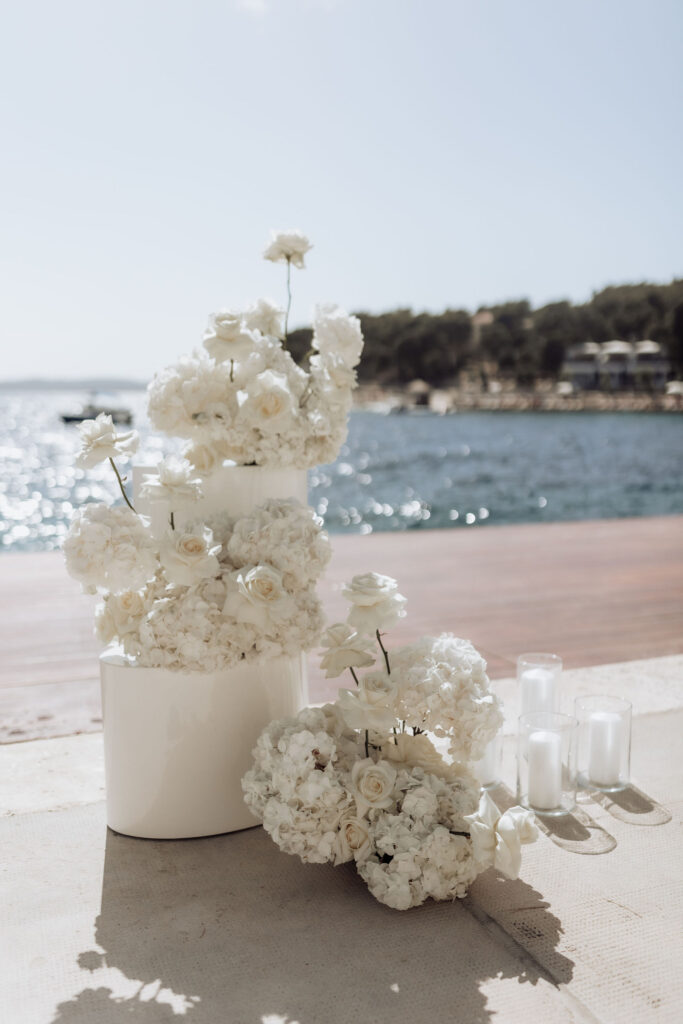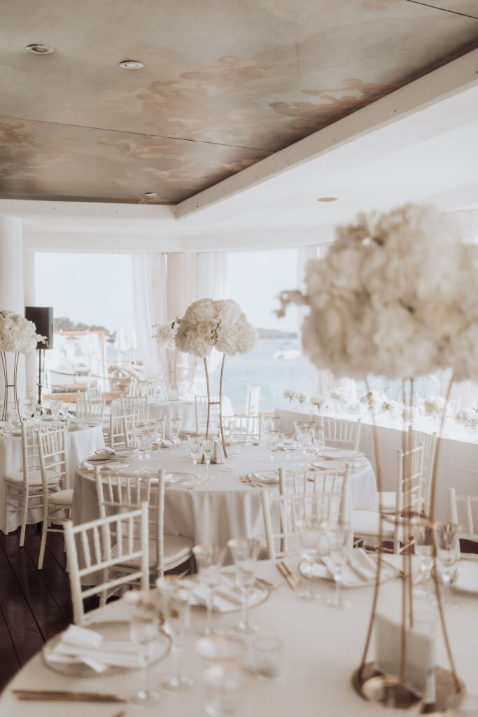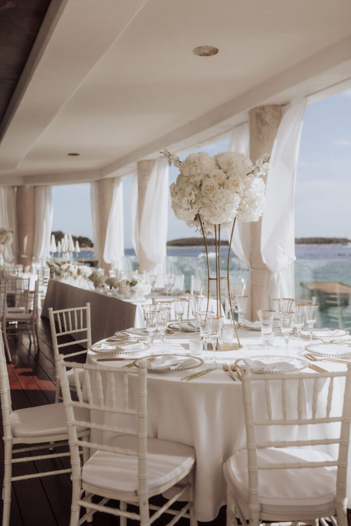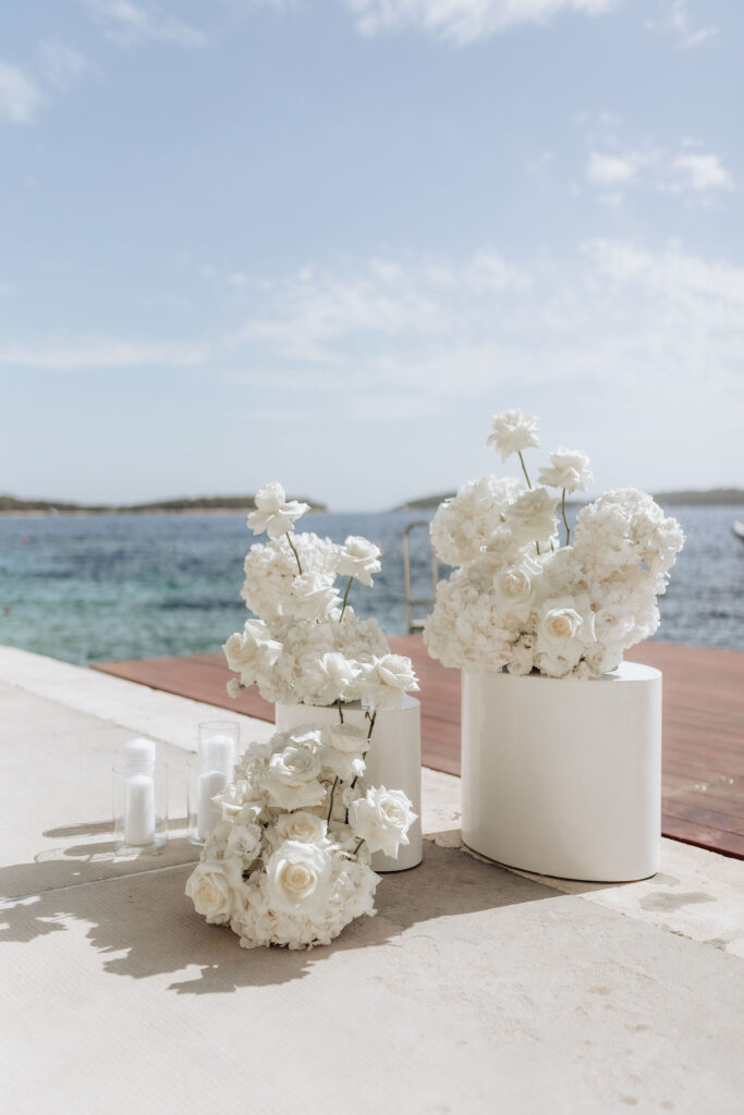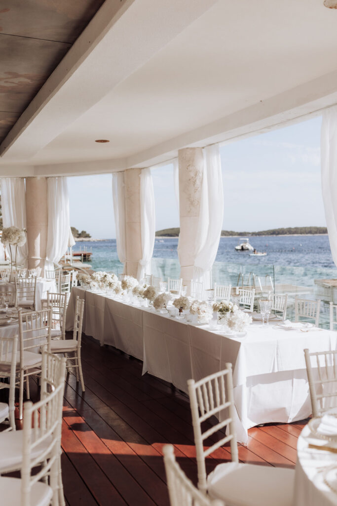 Since Olivia and Elliott desired a blend of traditional elegance and authenticity, we used white and neutral colors throughout. All tables featured sophisticated white linens with floral arrangements as centerpieces. As their event planner in Croatia, we went above and beyond to make their wedding unique and unforgettable.