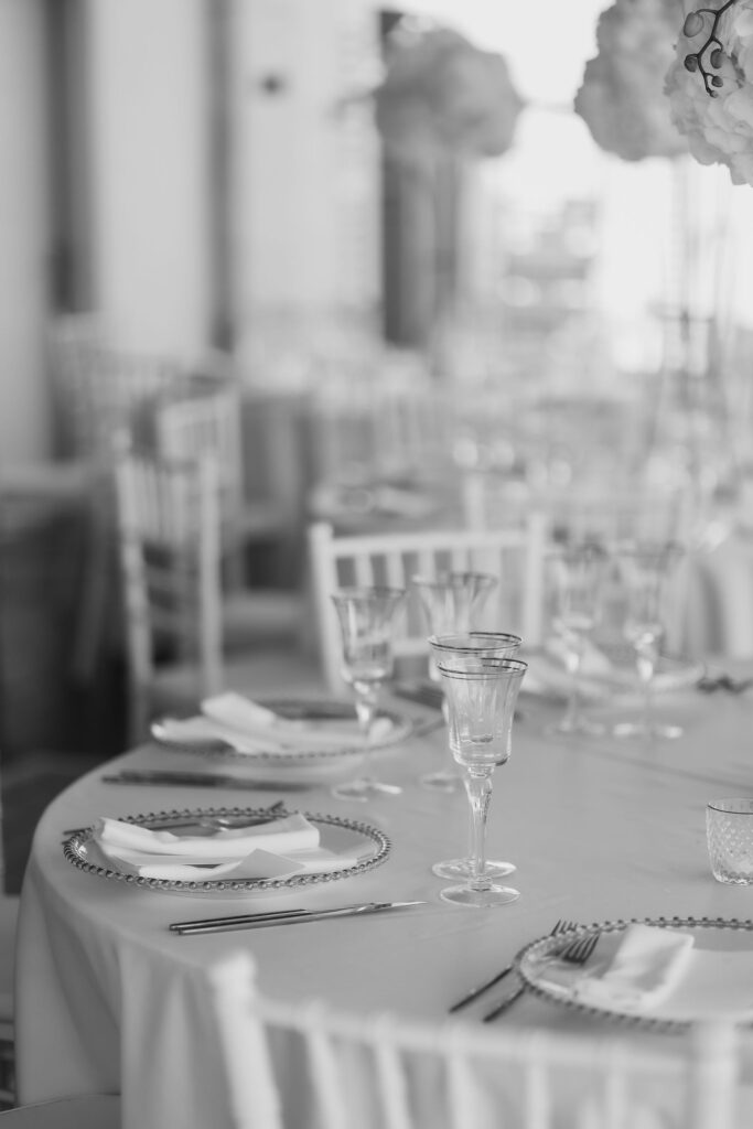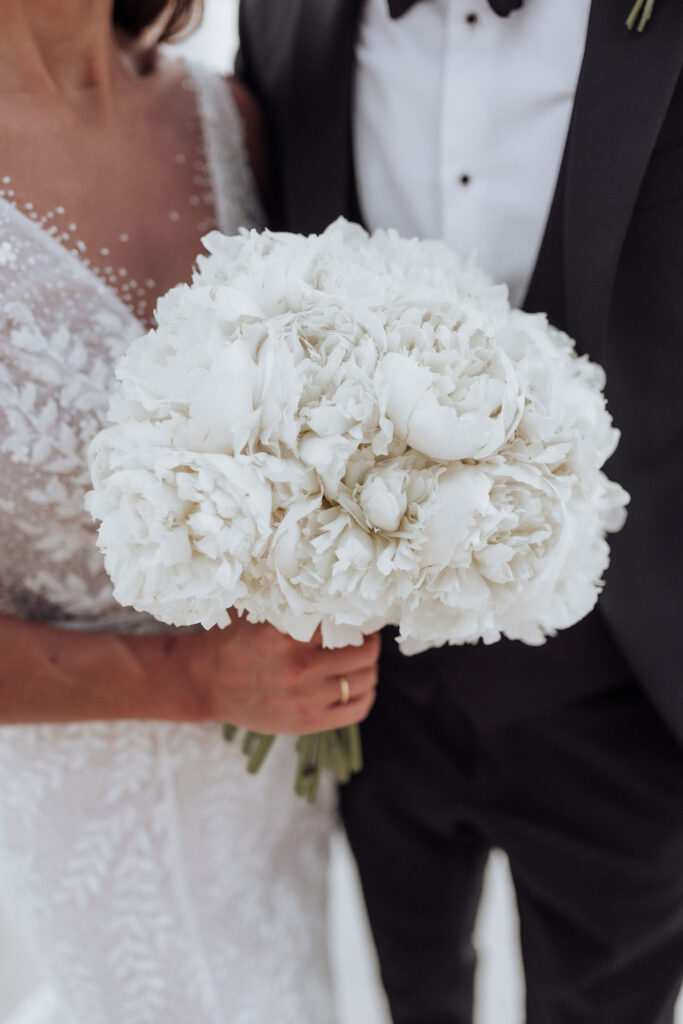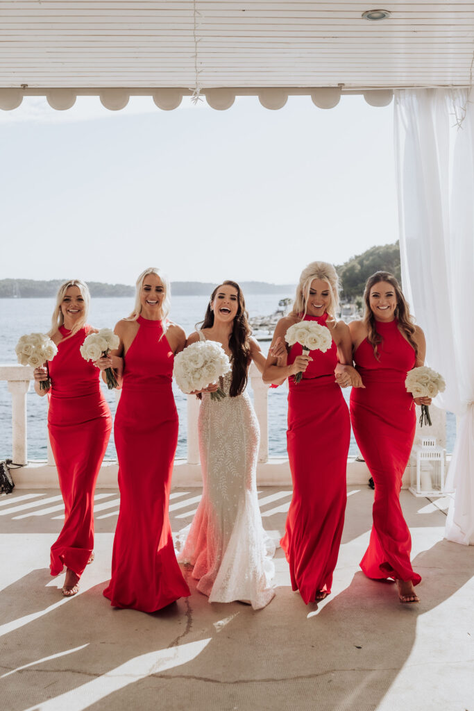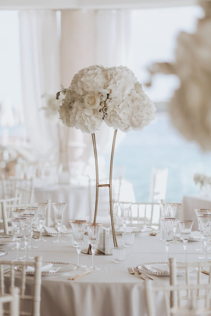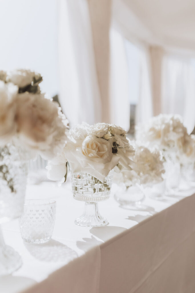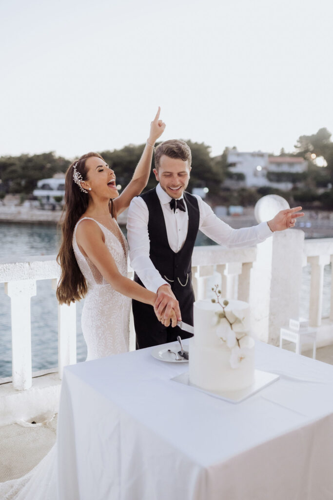 Since Olivia and Elliott desired a blend of traditional elegance and authenticity, we used white and neutral colors throughout. All tables featured sophisticated white linens with floral arrangements as centerpieces. As their event planner in Croatia, we went above and beyond to make their wedding unique and unforgettable.