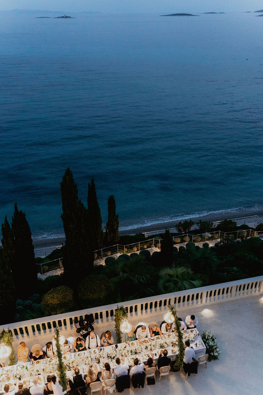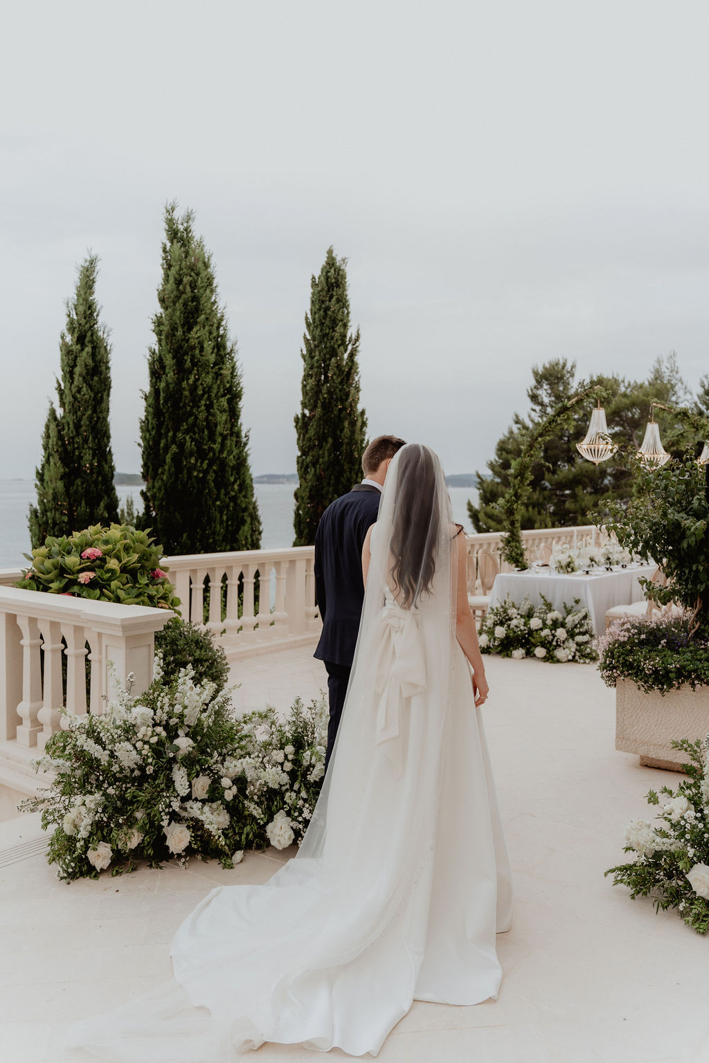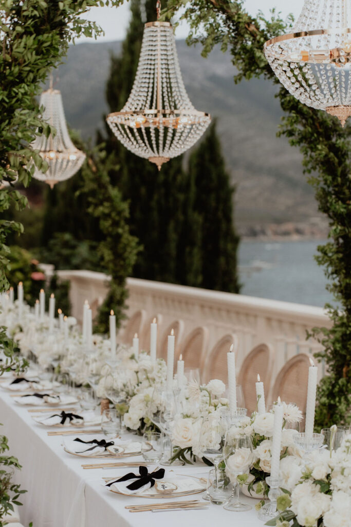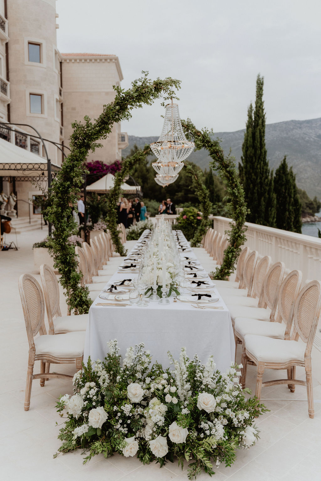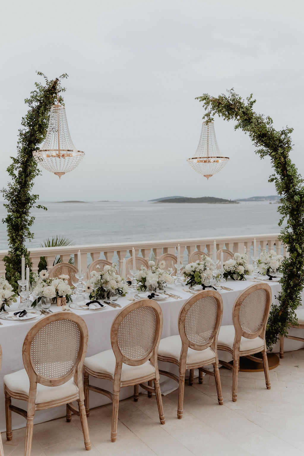 The design of the celebration embraced a classic palette: ivory and white florals, lush greenery, subtle black accents, and metallic highlights. Each detail was carefully curated to enhance the villa’s natural elegance. From the ceremony arch overlooking the sea to the candlelit dinner under the summer sky, the design struck a balance between tradition and modern refinement. This harmony created a setting that felt both contemporary and eternal, echoing the timeless romance of the Adriatic coast.