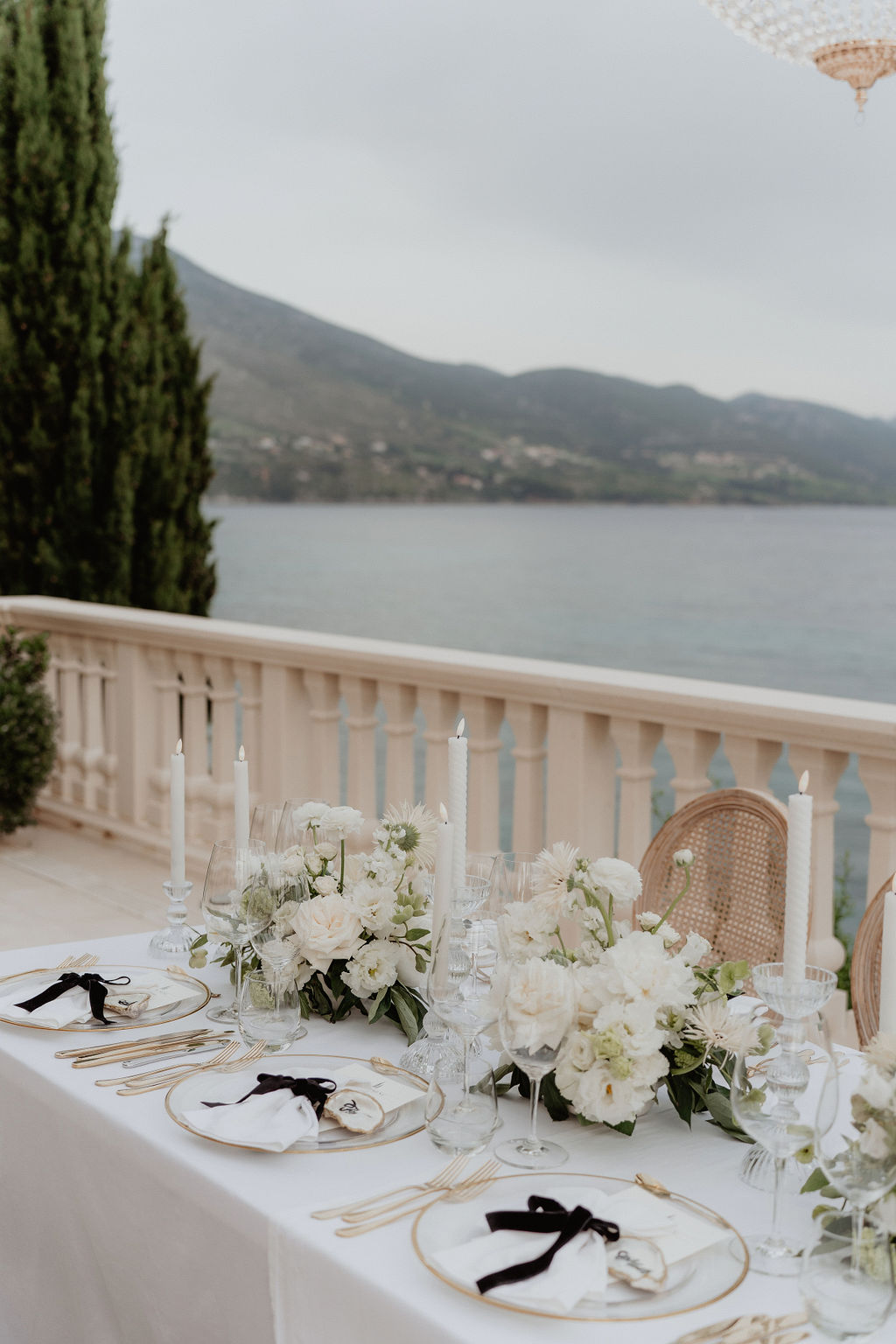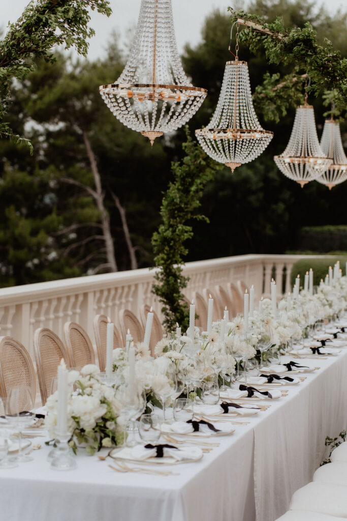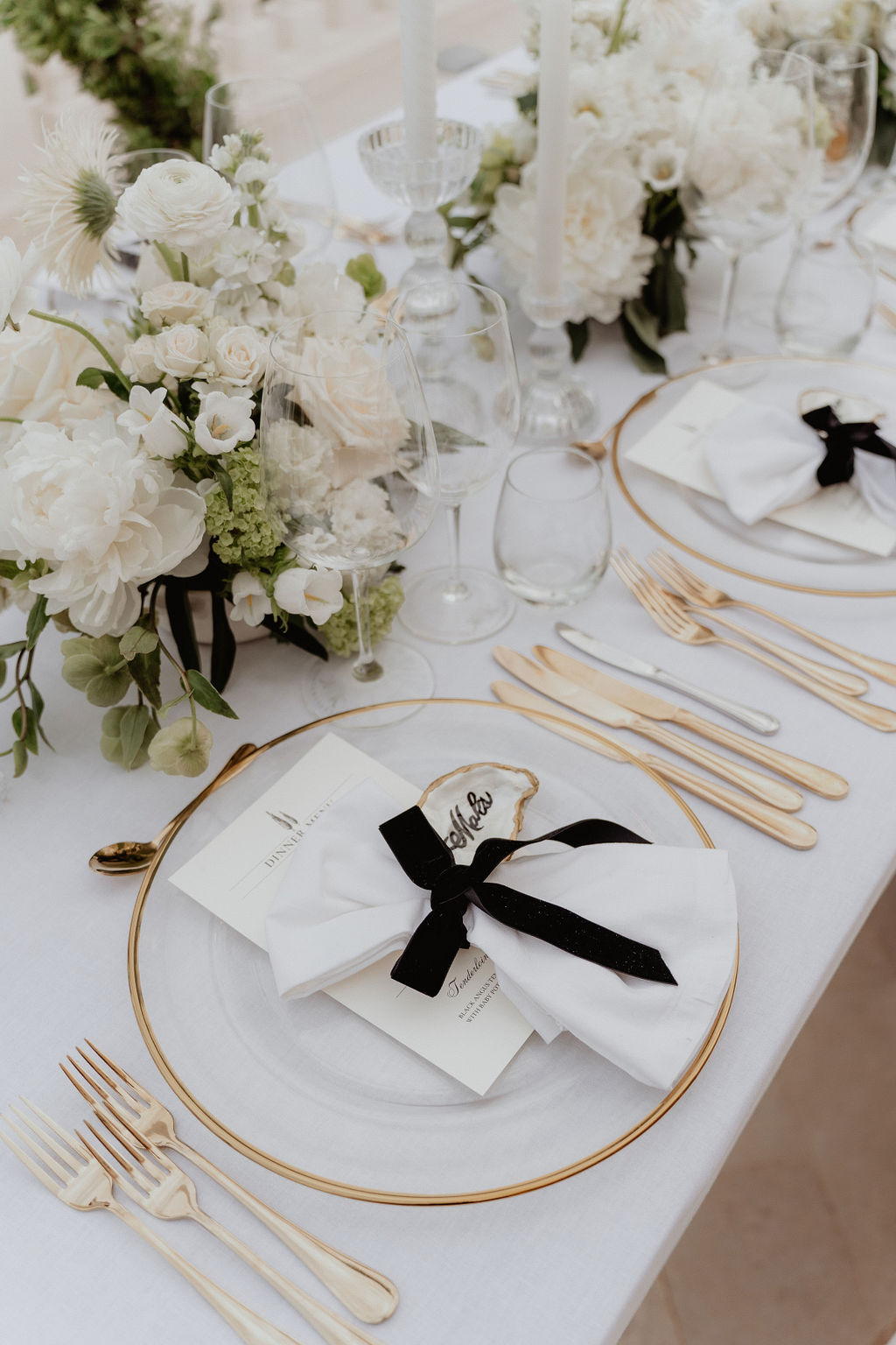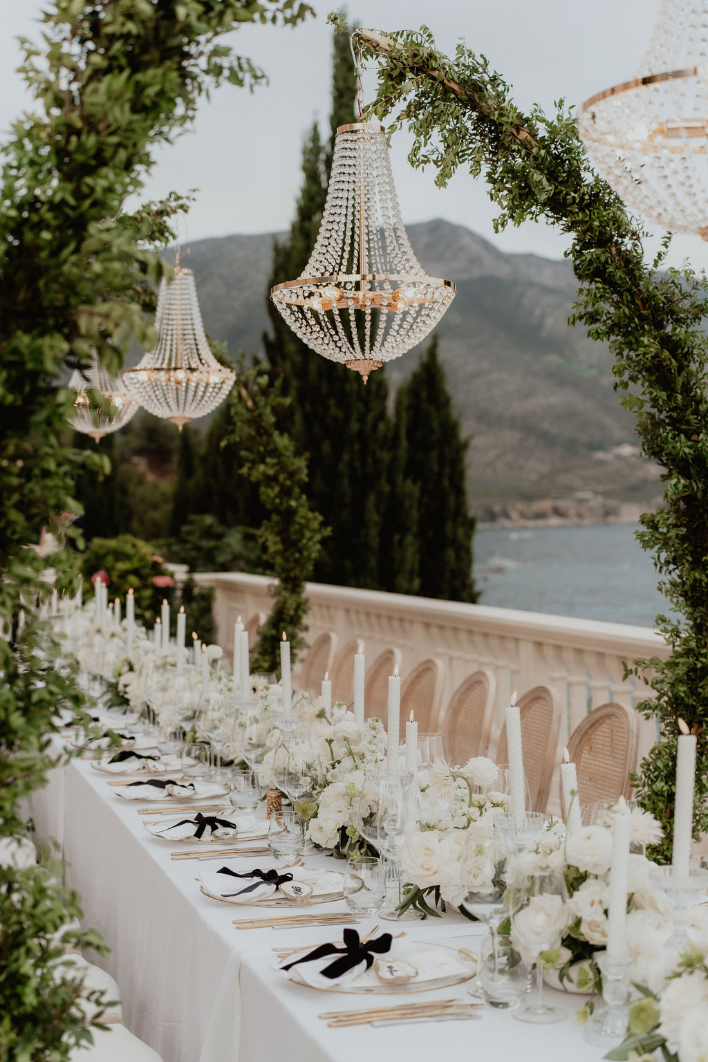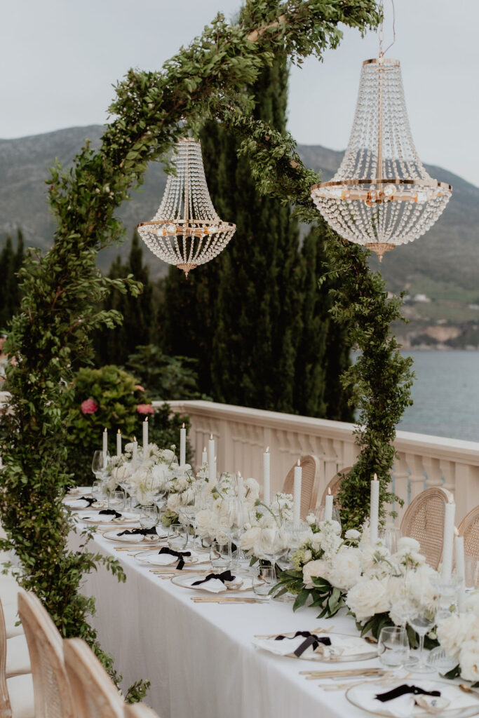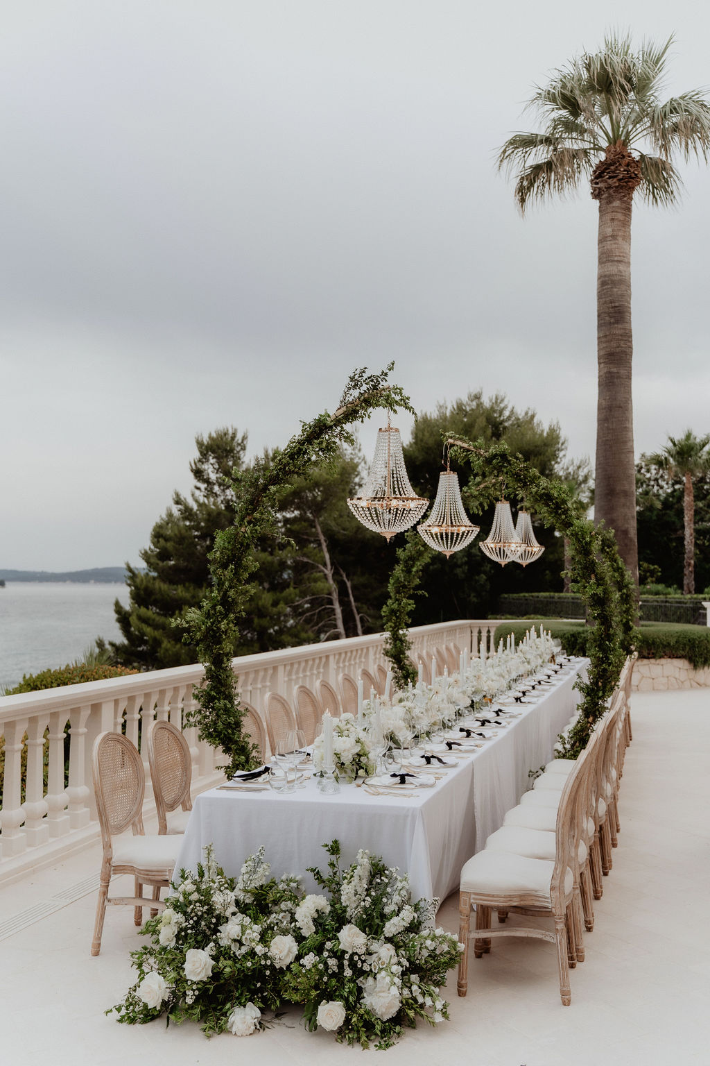 The design of the celebration embraced a classic palette: ivory and white florals, lush greenery, subtle black accents, and metallic highlights. Each detail was carefully curated to enhance the villa’s natural elegance. From the ceremony arch overlooking the sea to the candlelit dinner under the summer sky, the design struck a balance between tradition and modern refinement. This harmony created a setting that felt both contemporary and eternal, echoing the timeless romance of the Adriatic coast.