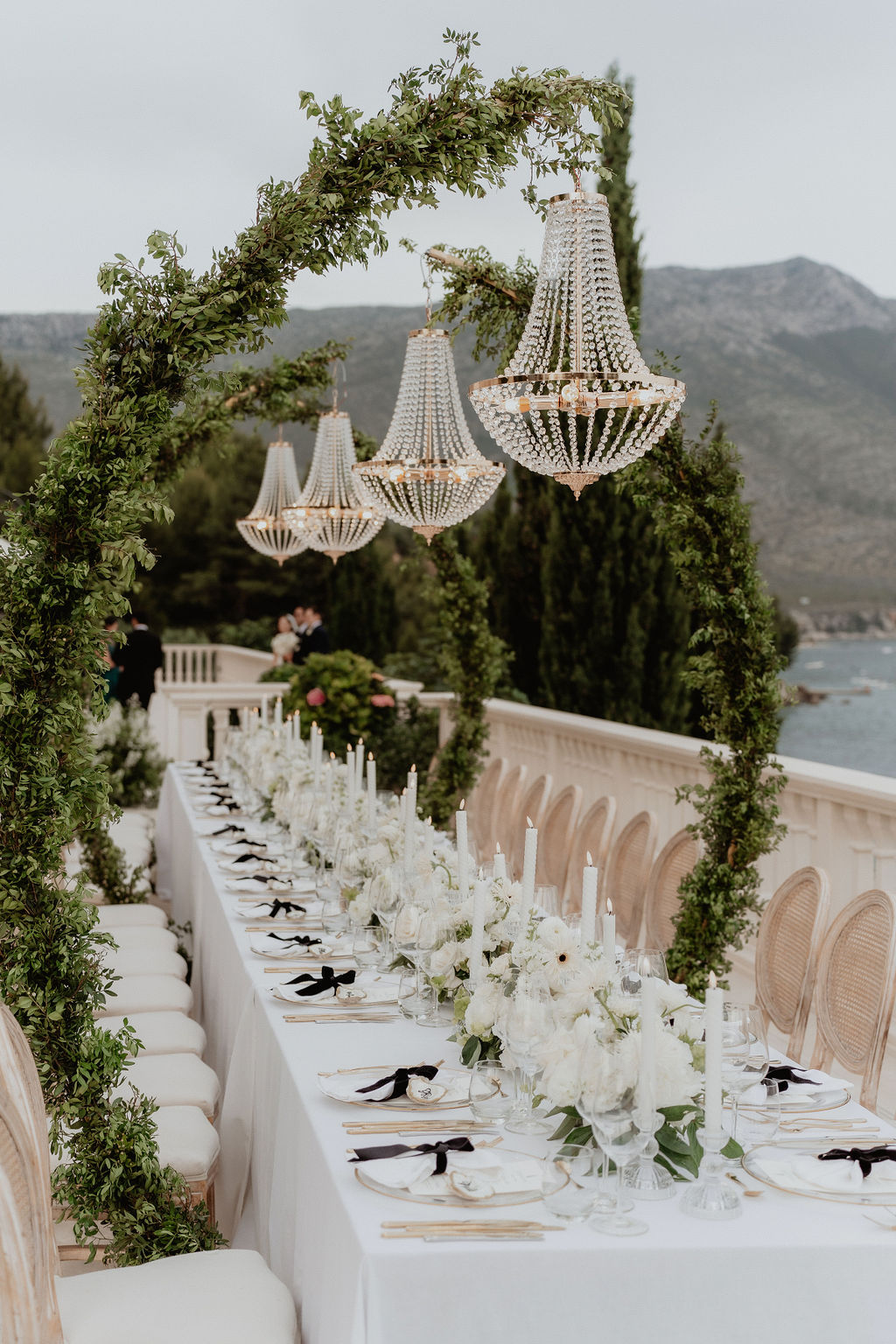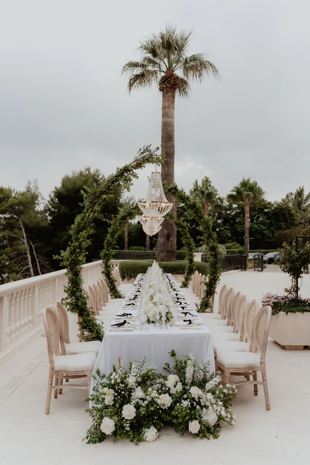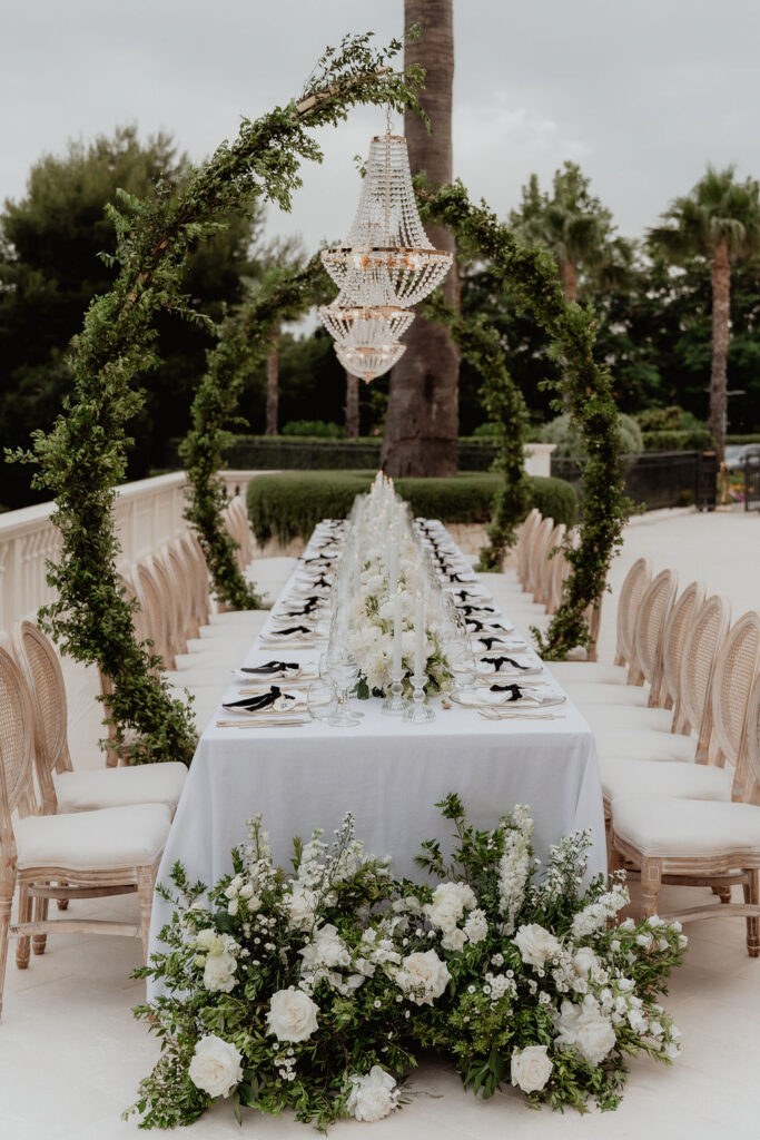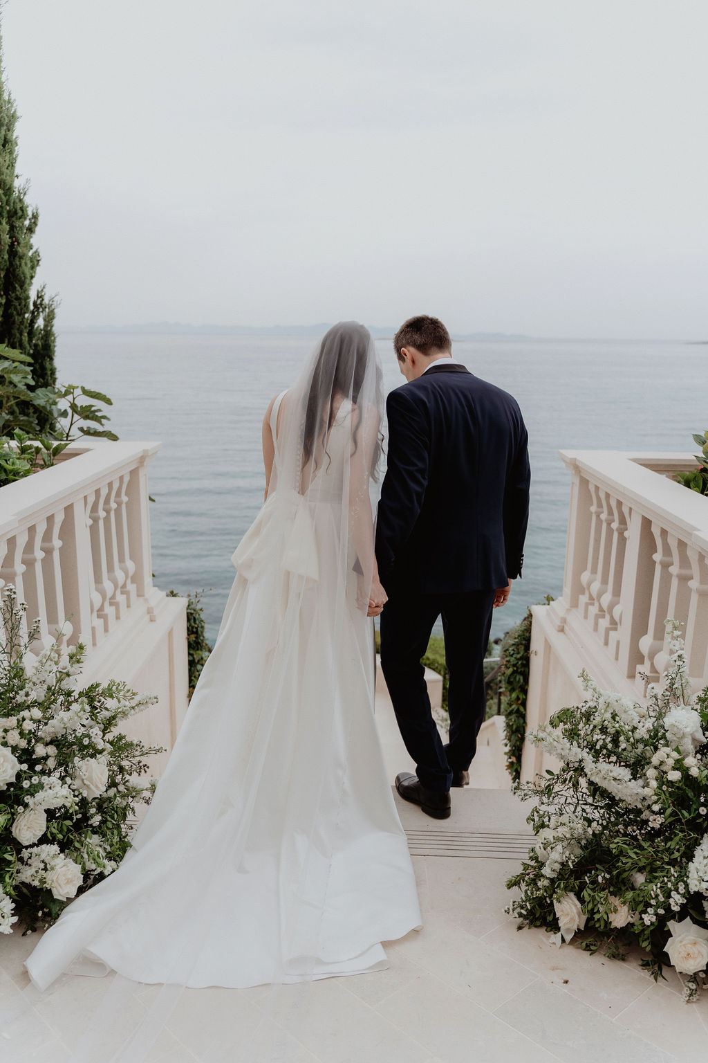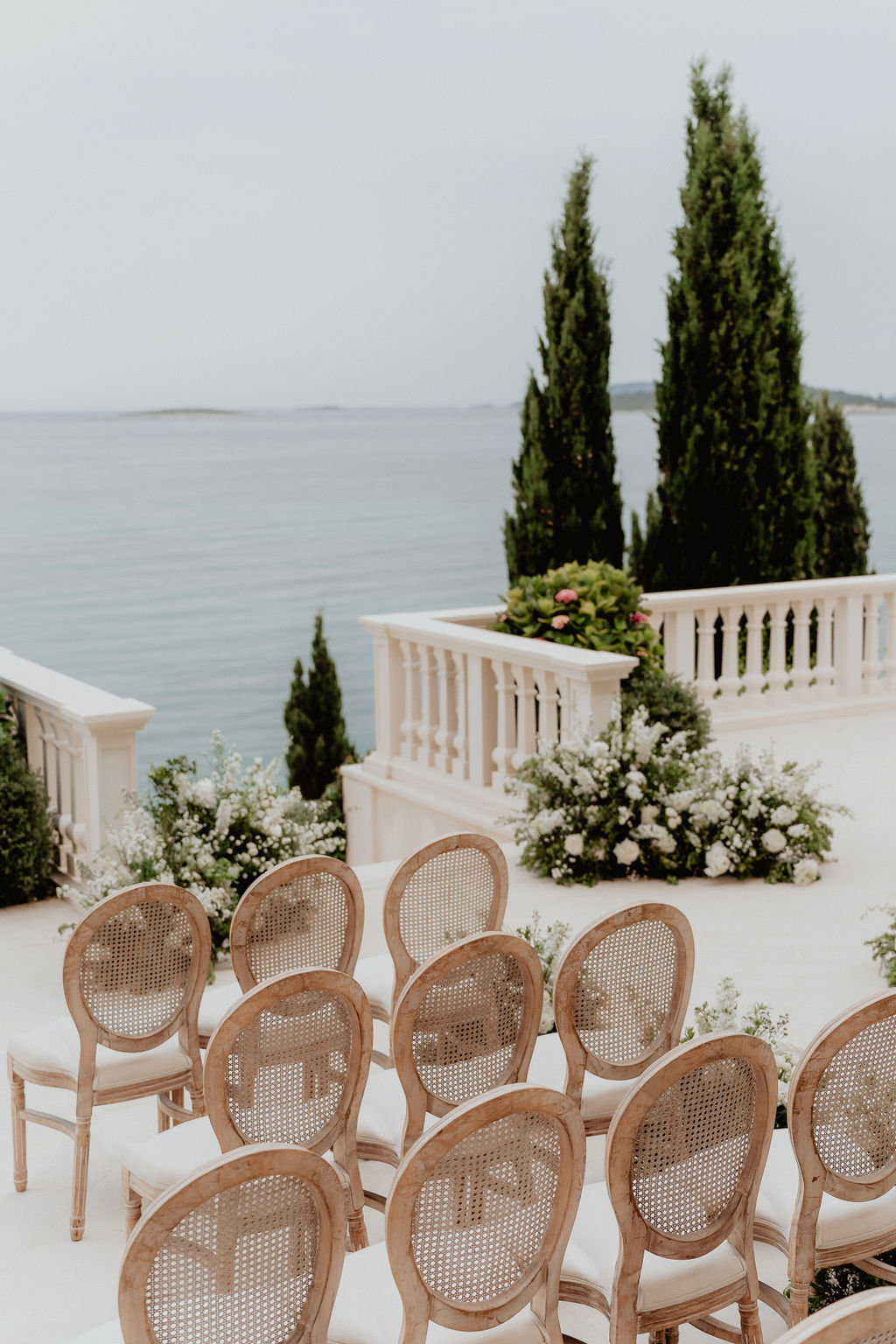 The design of the celebration embraced a classic palette: ivory and white florals, lush greenery, subtle black accents, and metallic highlights. Each detail was carefully curated to enhance the villa’s natural elegance. From the ceremony arch overlooking the sea to the candlelit dinner under the summer sky, the design struck a balance between tradition and modern refinement. This harmony created a setting that felt both contemporary and eternal, echoing the timeless romance of the Adriatic coast.