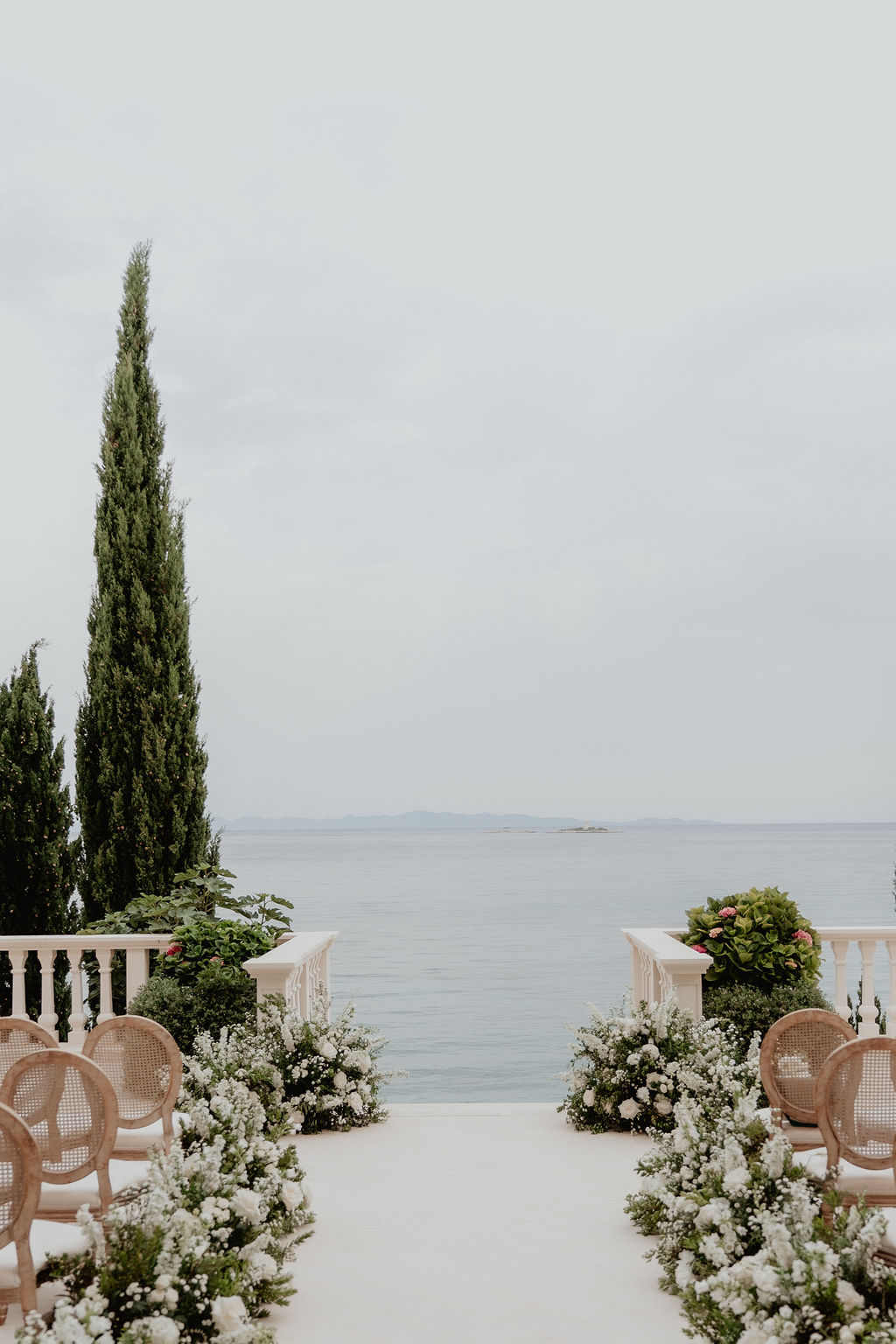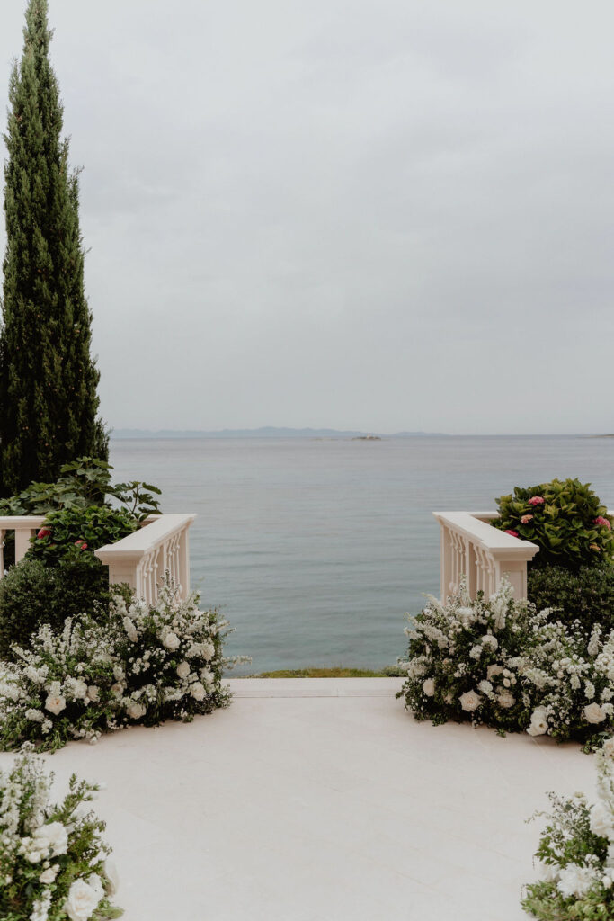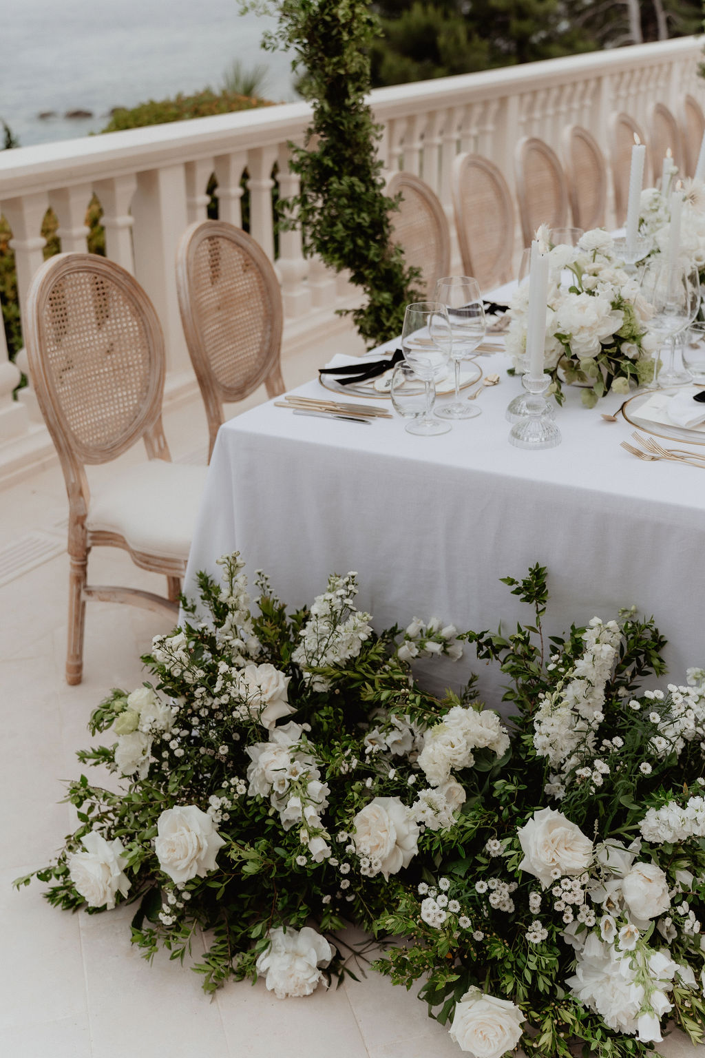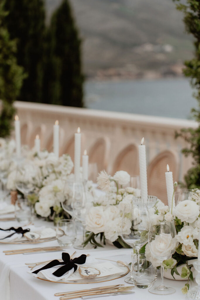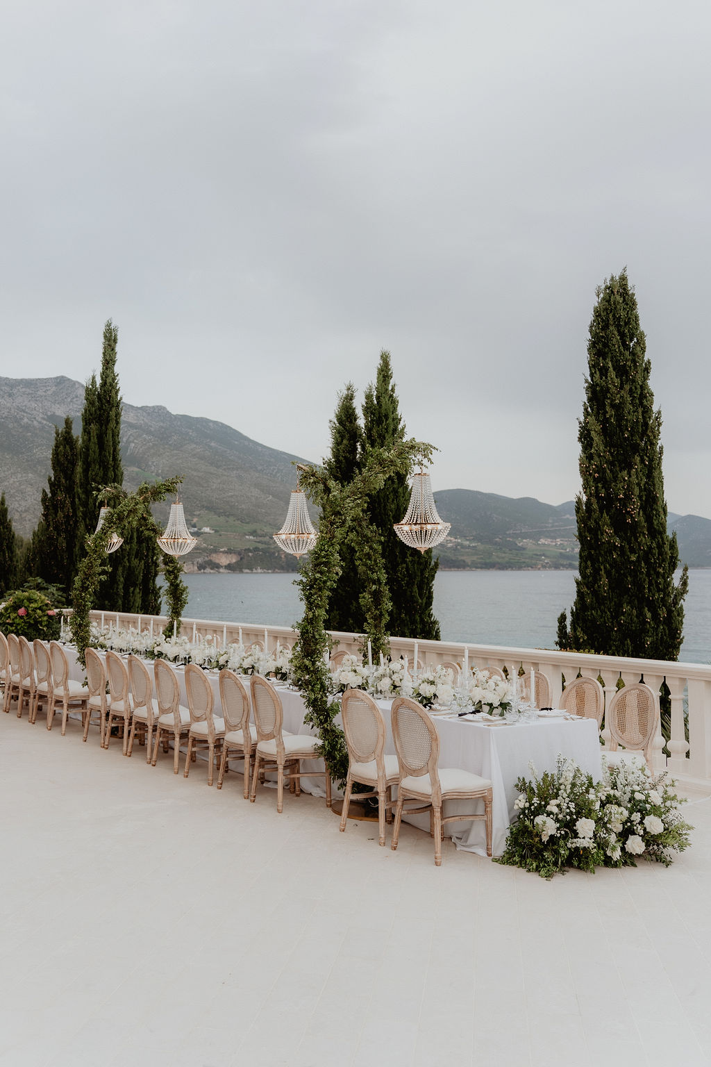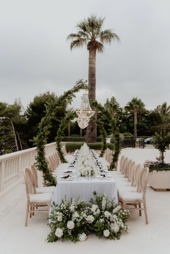The design of the celebration embraced a classic palette: ivory and white florals, lush greenery, subtle black accents, and metallic highlights. Each detail was carefully curated to enhance the villa’s natural elegance. From the ceremony arch overlooking the sea to the candlelit dinner under the summer sky, the design struck a balance between tradition and modern refinement. This harmony created a setting that felt both contemporary and eternal, echoing the timeless romance of the Adriatic coast.