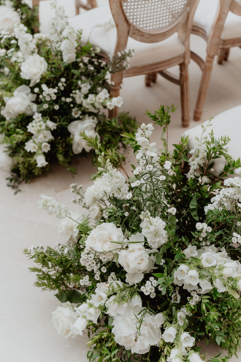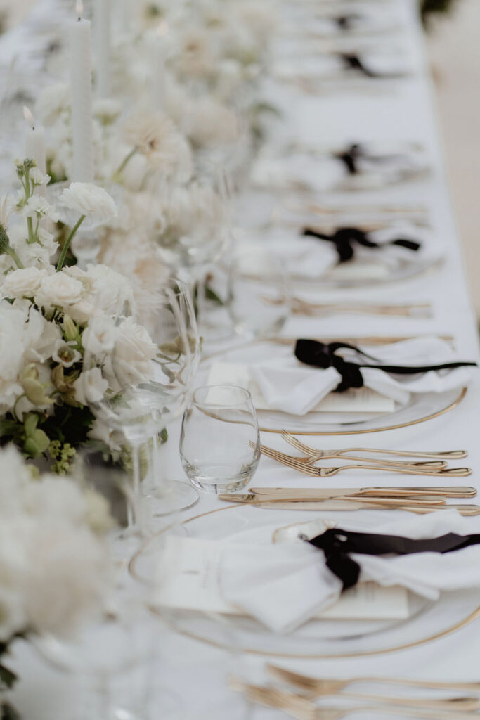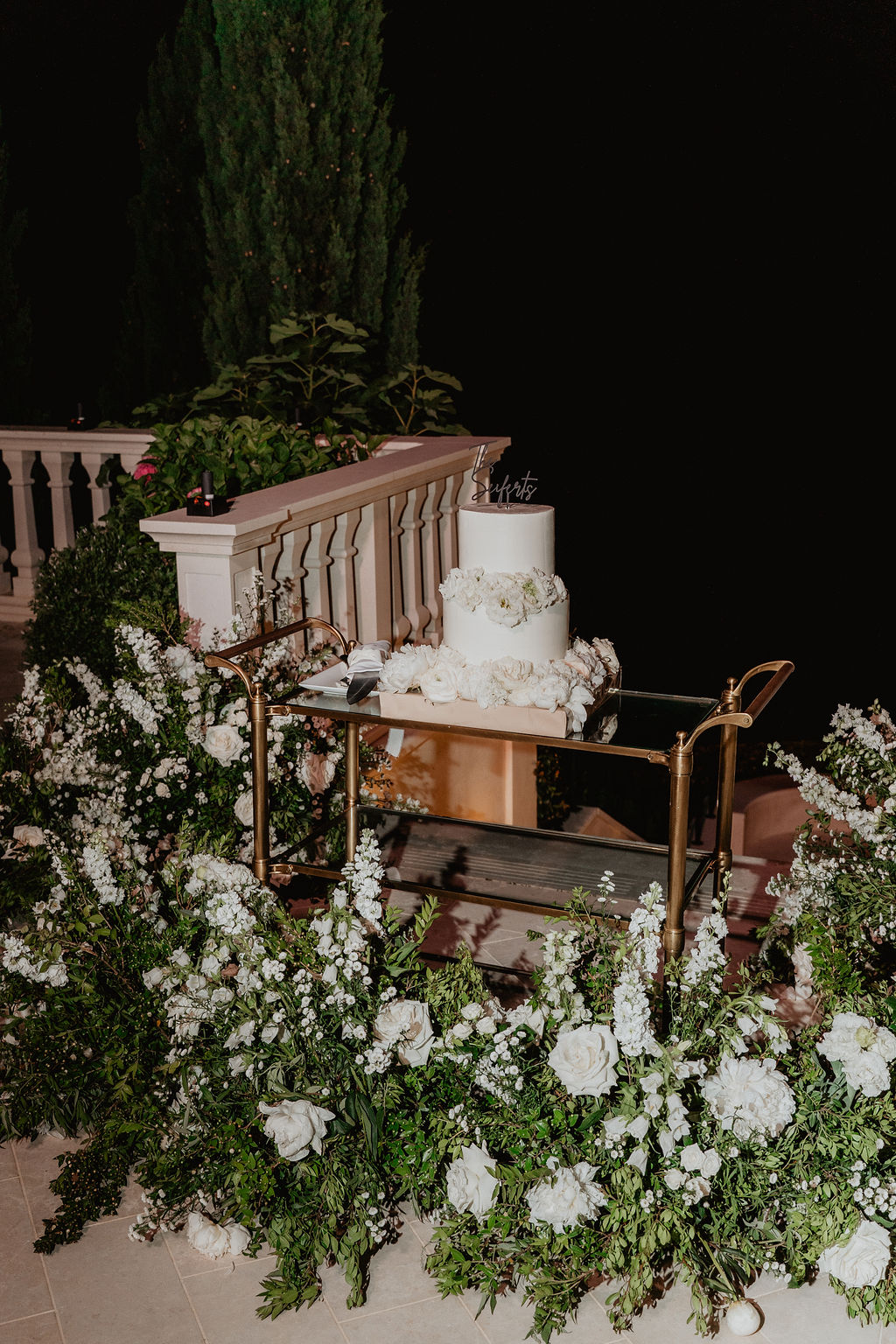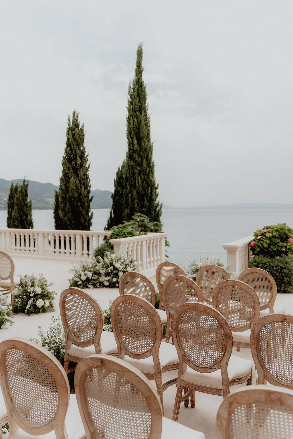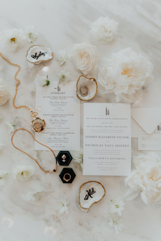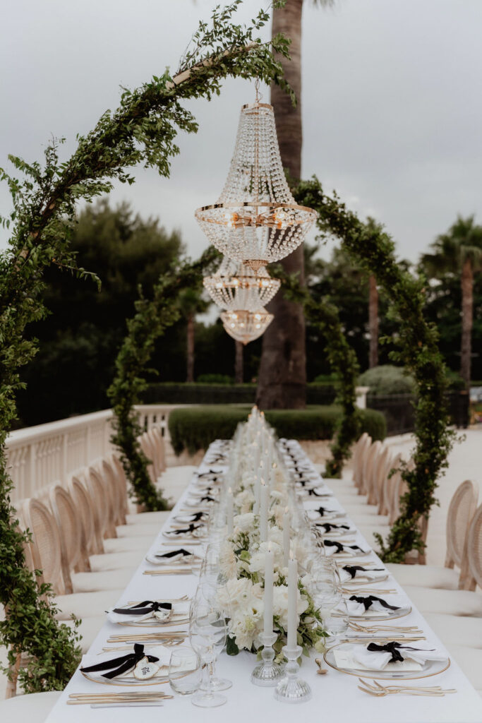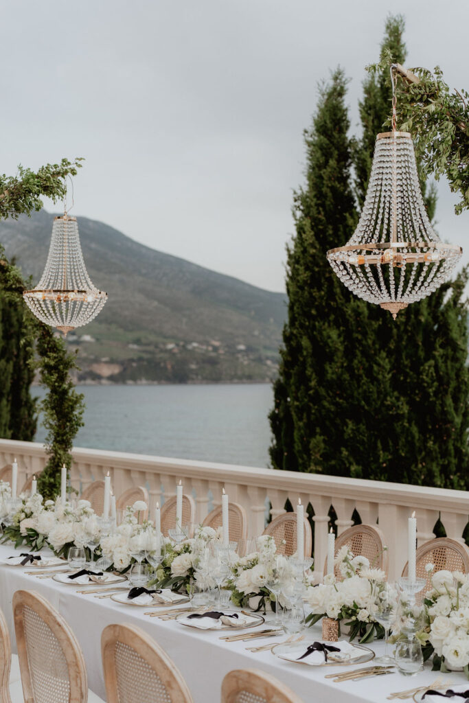 The design of the celebration embraced a classic palette: ivory and white florals, lush greenery, subtle black accents, and metallic highlights. Each detail was carefully curated to enhance the villa’s natural elegance. From the ceremony arch overlooking the sea to the candlelit dinner under the summer sky, the design struck a balance between tradition and modern refinement. This harmony created a setting that felt both contemporary and eternal, echoing the timeless romance of the Adriatic coast.