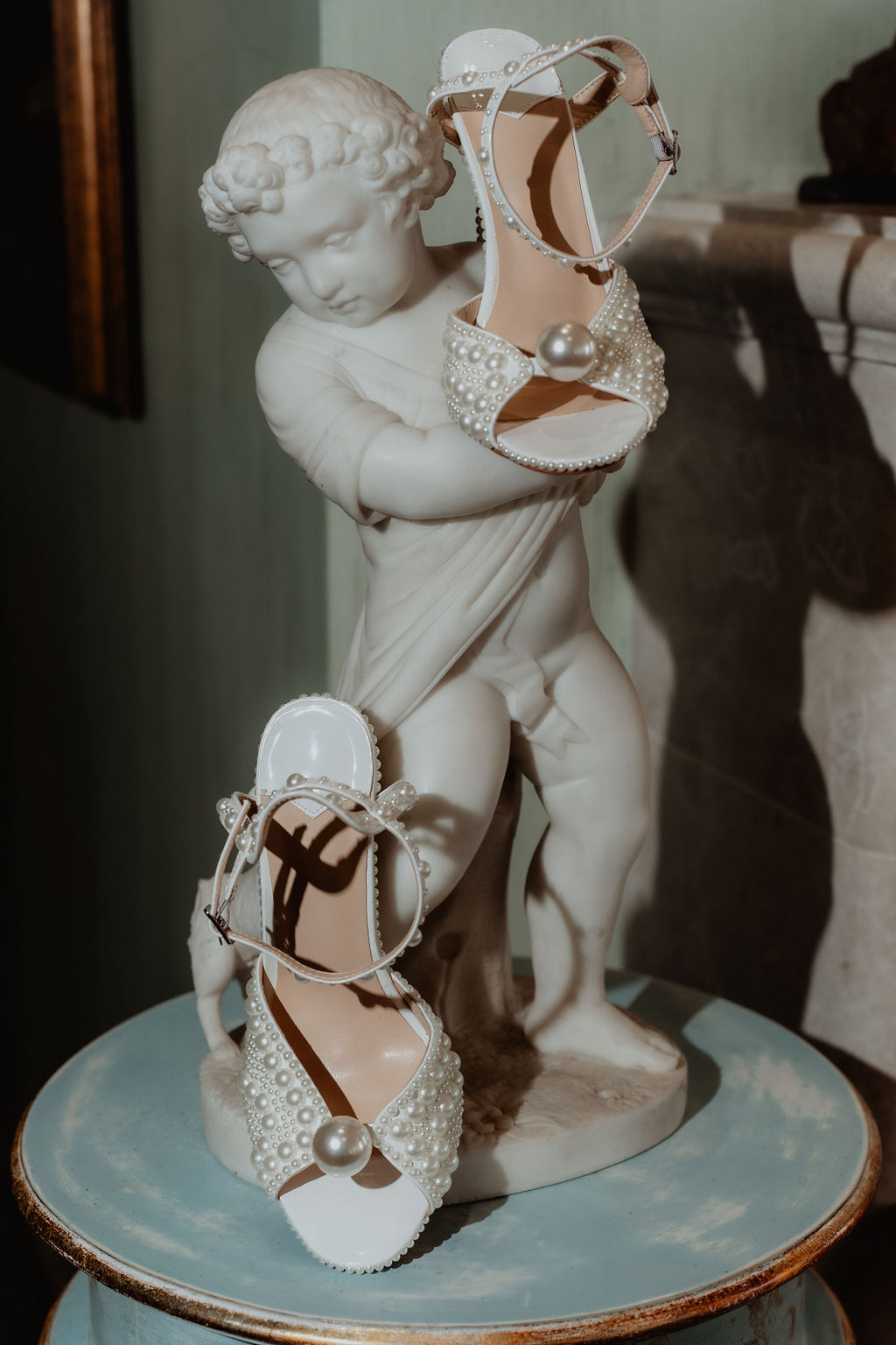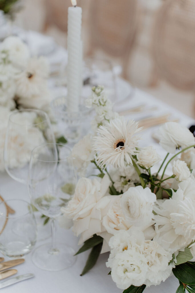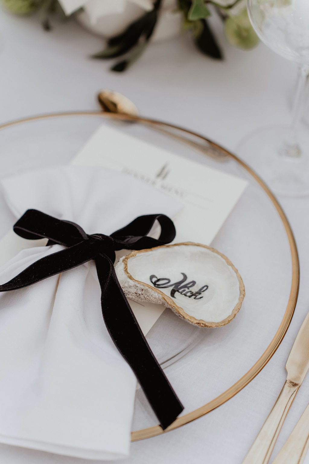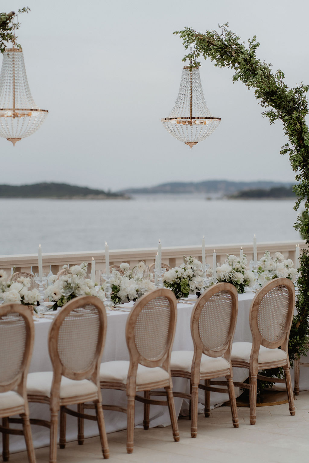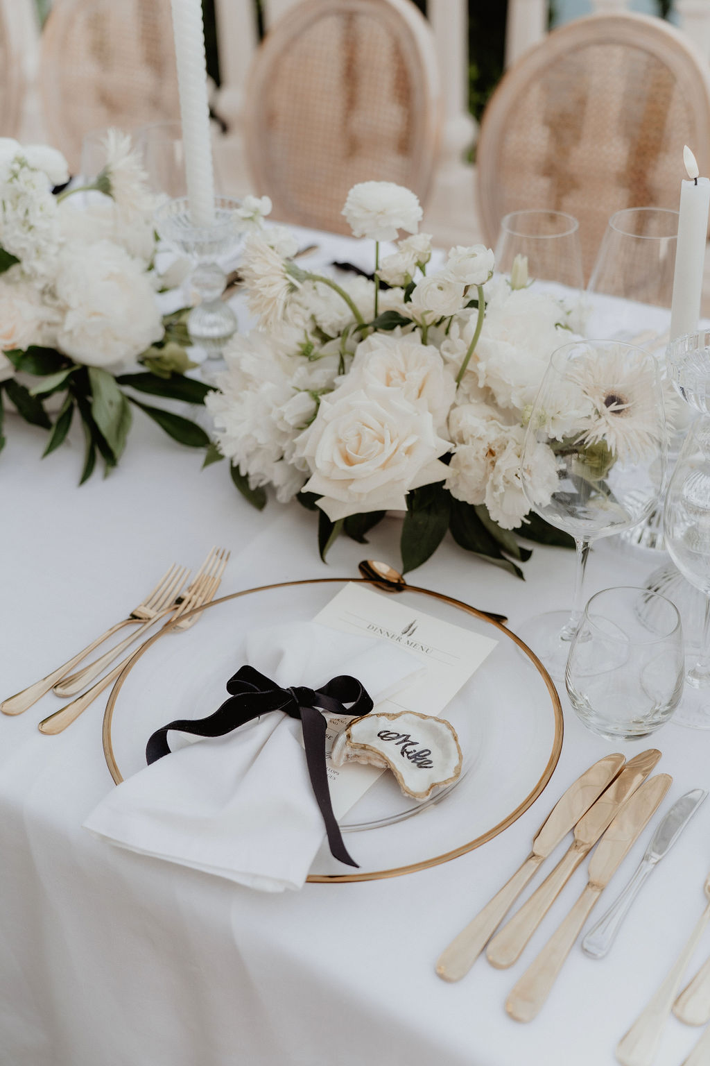 The design of the celebration embraced a classic palette: ivory and white florals, lush greenery, subtle black accents, and metallic highlights. Each detail was carefully curated to enhance the villa’s natural elegance. From the ceremony arch overlooking the sea to the candlelit dinner under the summer sky, the design struck a balance between tradition and modern refinement. This harmony created a setting that felt both contemporary and eternal, echoing the timeless romance of the Adriatic coast.