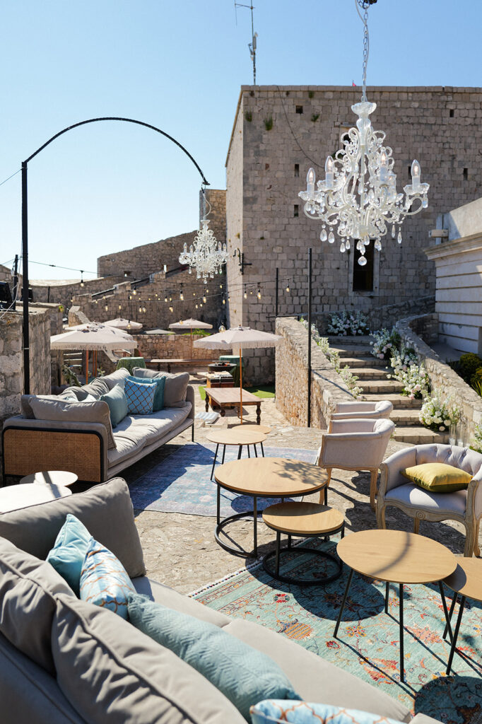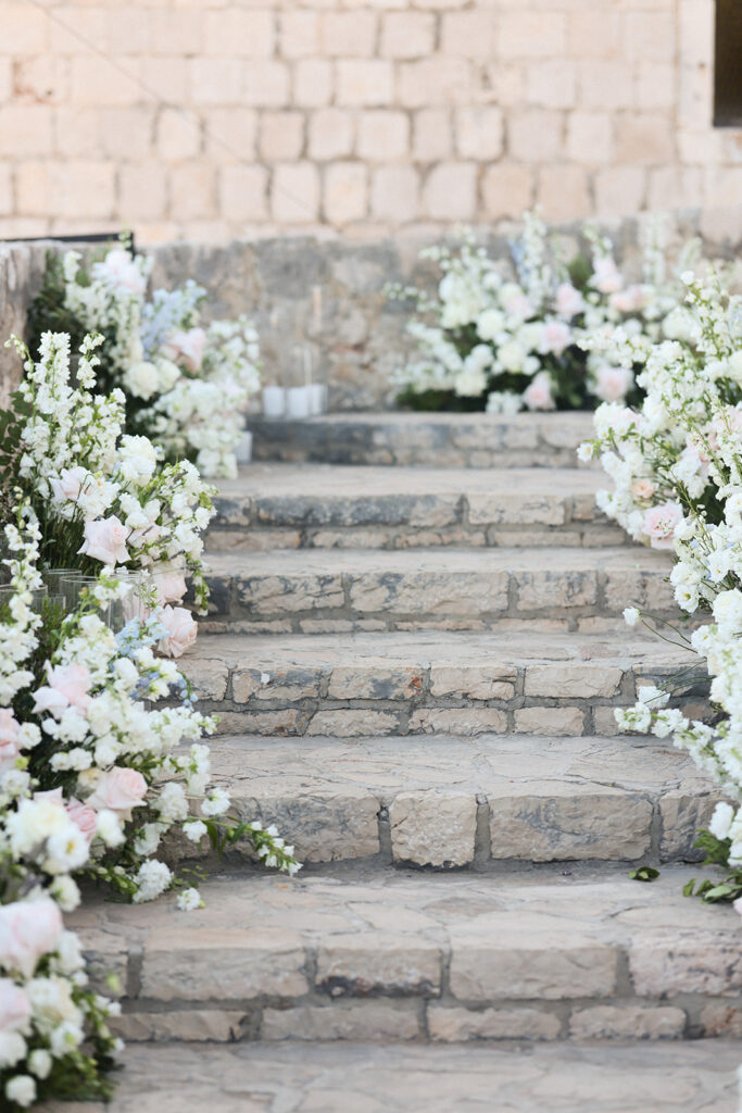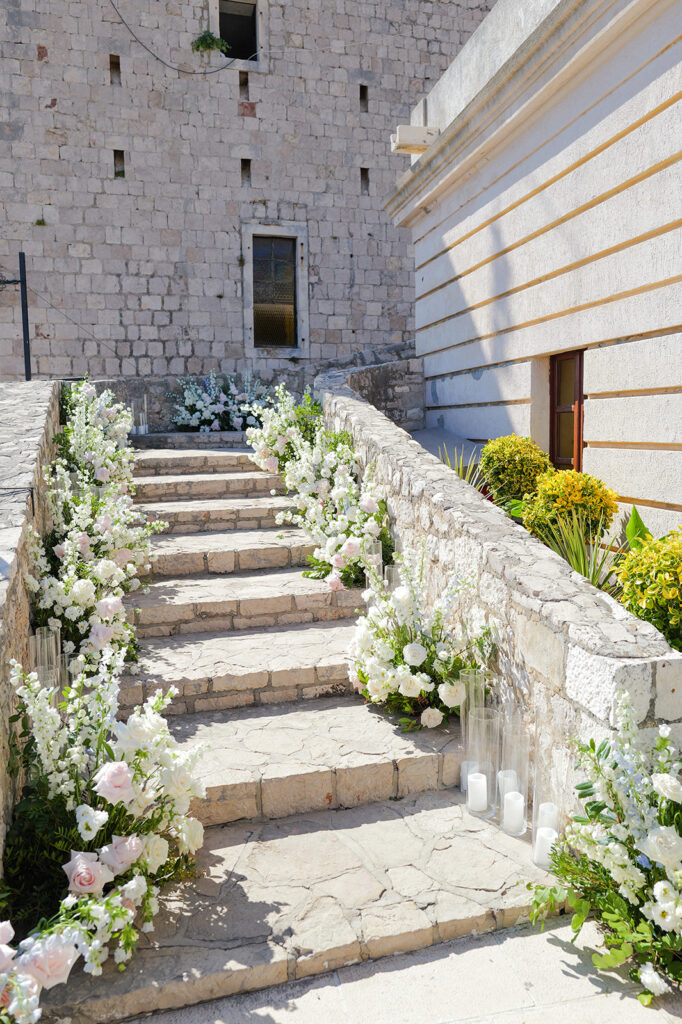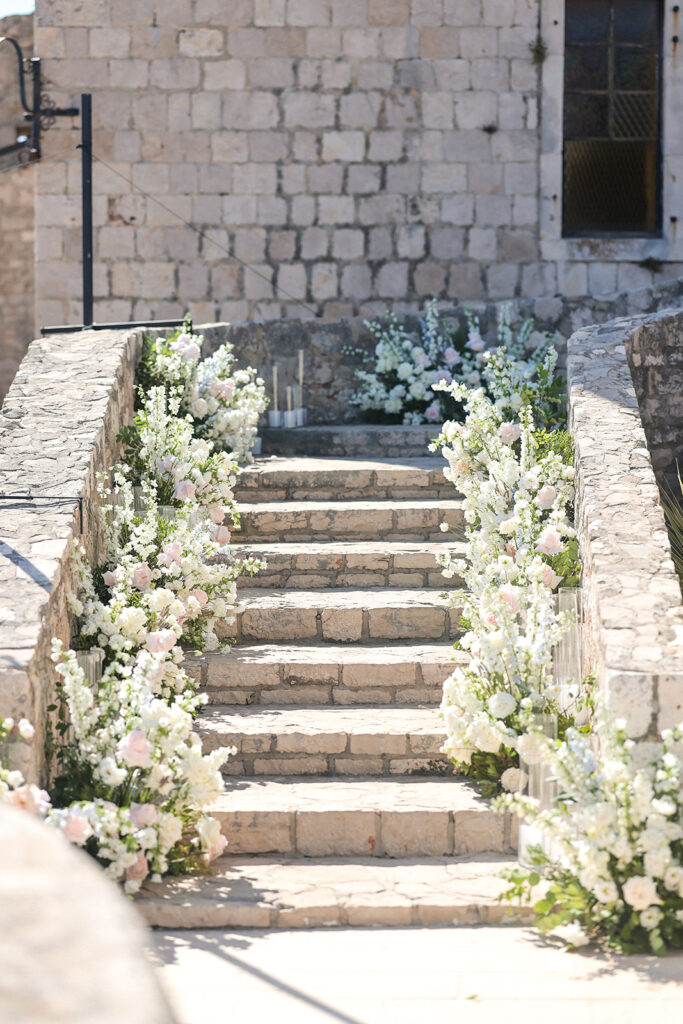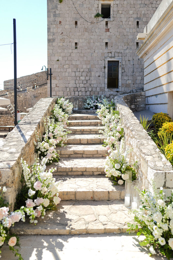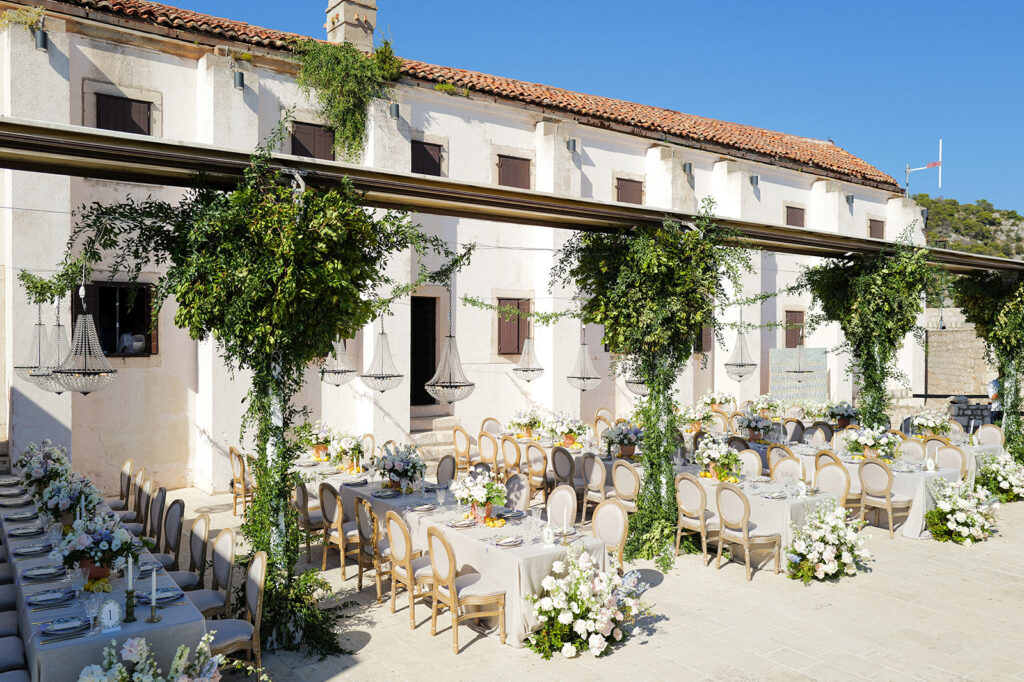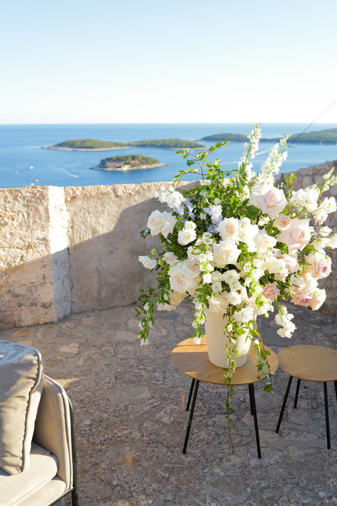 Upon arriving at the majestic Spanish Fortress in Hvar, the couple and their guests were immediately captivated by its breathtaking views of the glittering port below. Showroom Design, known for its artistry, transformed the venue into a luxurious setting. By combining lush florals, elegant chandeliers, and refined tablescapes, they created an ambiance that reflected both the historic charm of Croatia and timeless sophistication.