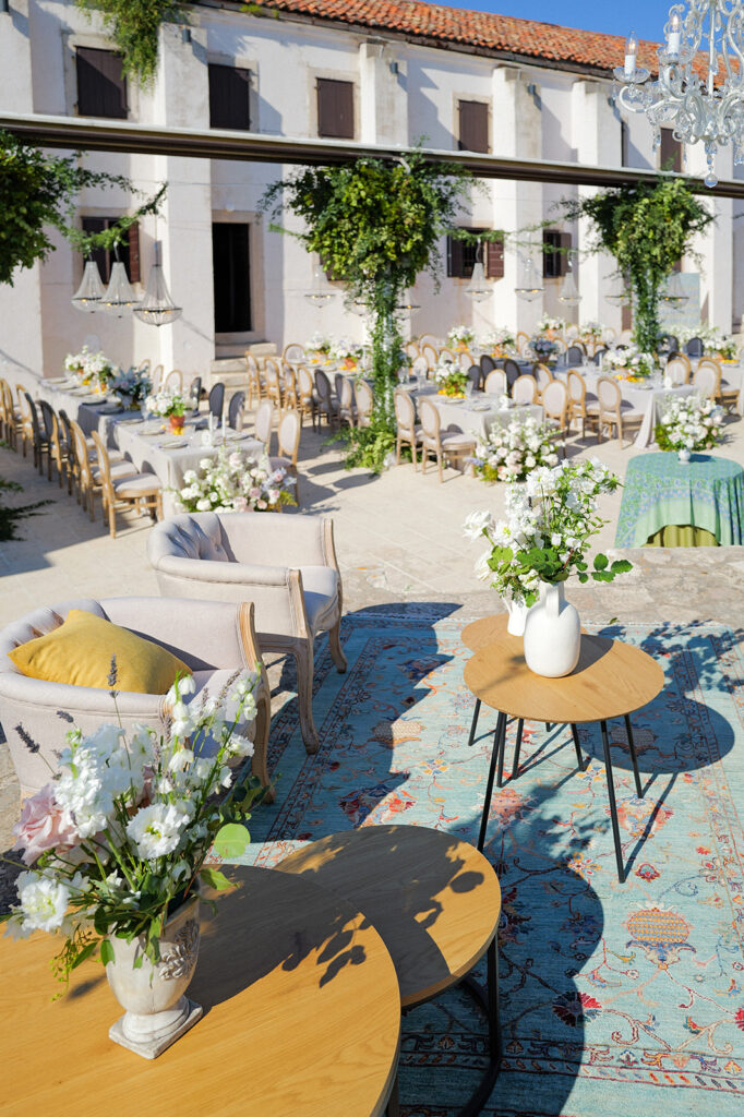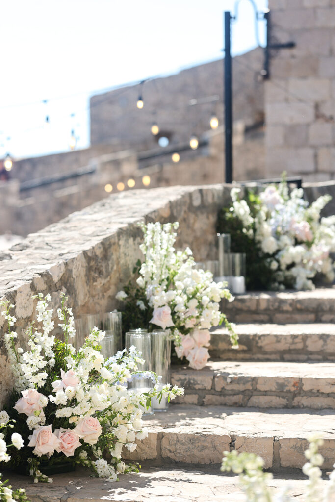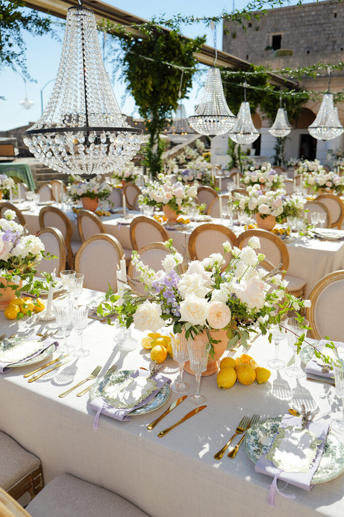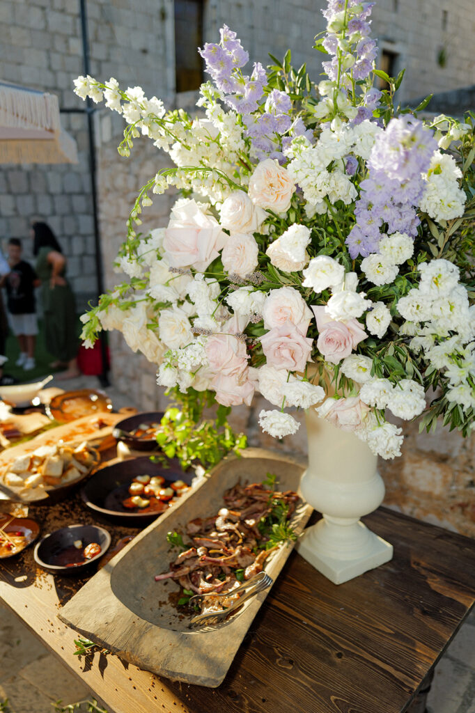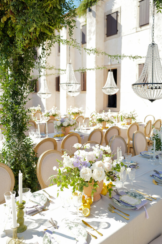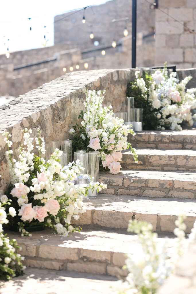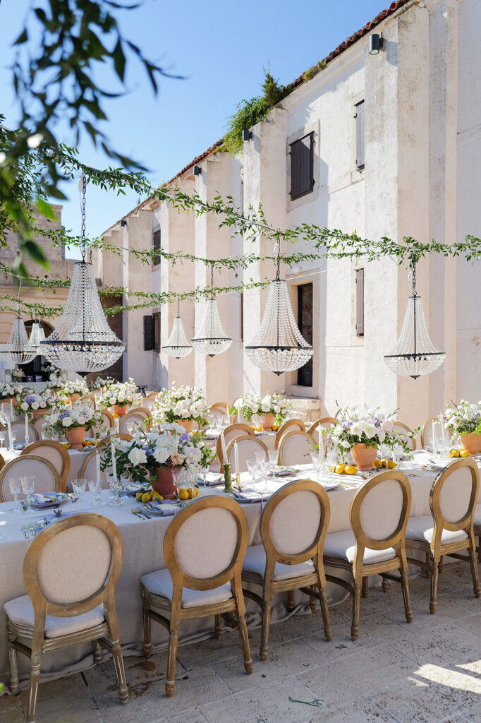 Upon arriving at the majestic Spanish Fortress in Hvar, the couple and their guests were immediately captivated by its breathtaking views of the glittering port below. Showroom Design, known for its artistry, transformed the venue into a luxurious setting. By combining lush florals, elegant chandeliers, and refined tablescapes, they created an ambiance that reflected both the historic charm of Croatia and timeless sophistication.