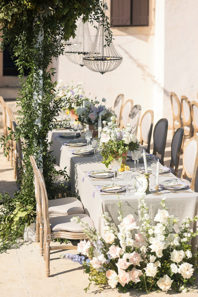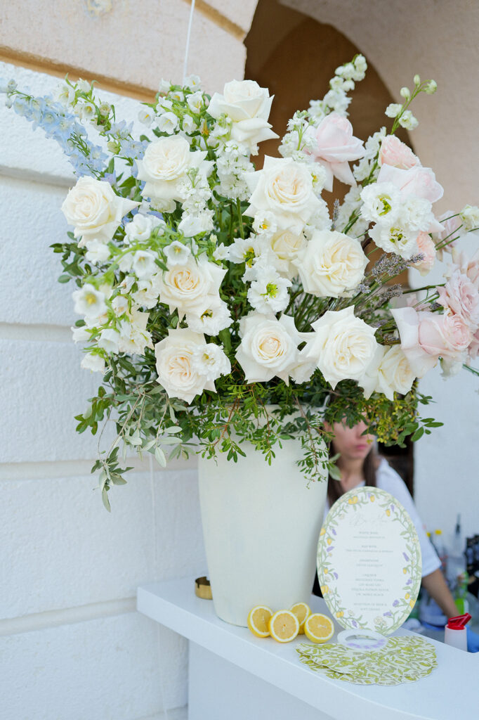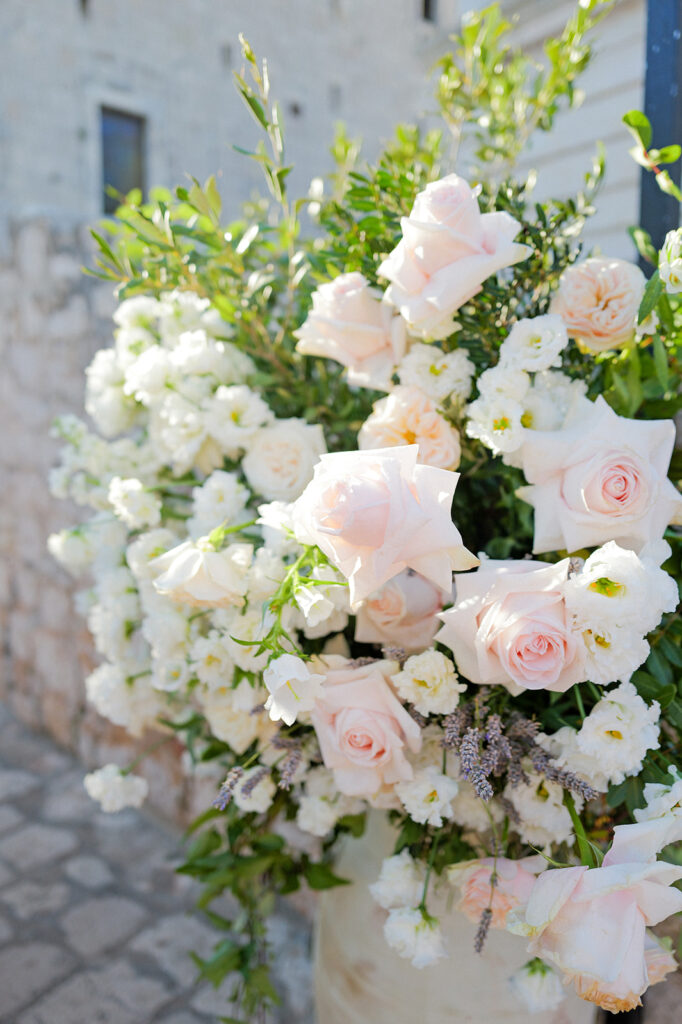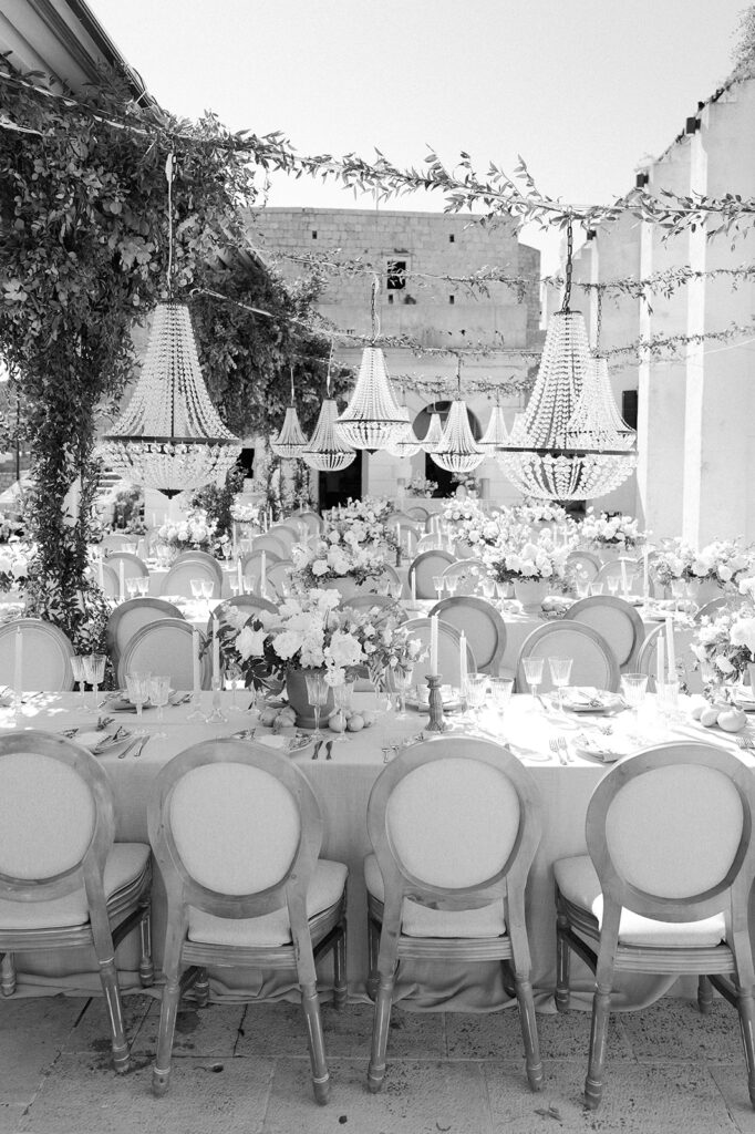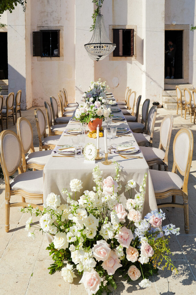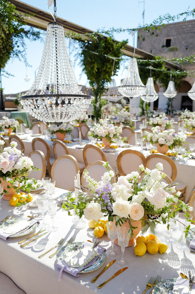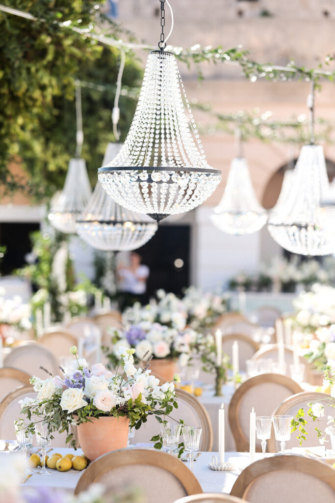 Upon arriving at the majestic Spanish Fortress in Hvar, the couple and their guests were immediately captivated by its breathtaking views of the glittering port below. Showroom Design, known for its artistry, transformed the venue into a luxurious setting. By combining lush florals, elegant chandeliers, and refined tablescapes, they created an ambiance that reflected both the historic charm of Croatia and timeless sophistication.