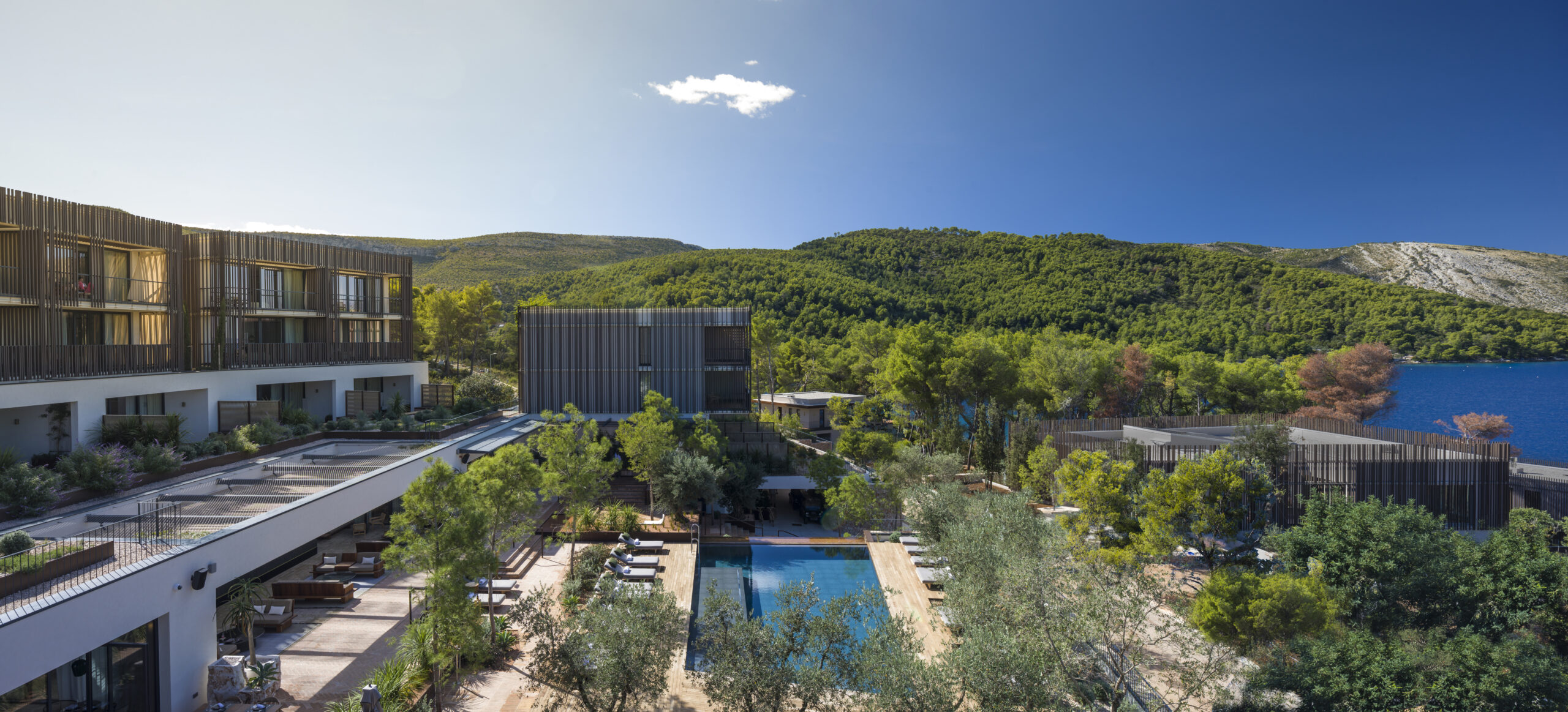 Located in the Maslinica Bay on Hvar island, a new mindful luxury resort surrounded by olive groves and terraced vineyards. The resort stretches over 2 hectares in the middle of a pine forest, with a view of the crystalline Adriatic Sea. All of Maslina’s fifty-three accommodations enjoy stunning sea views, total privacy, and absolute comfort. The Resort’s interior design embraces natural and local materials such as terracotta, stone, brass, and wood.